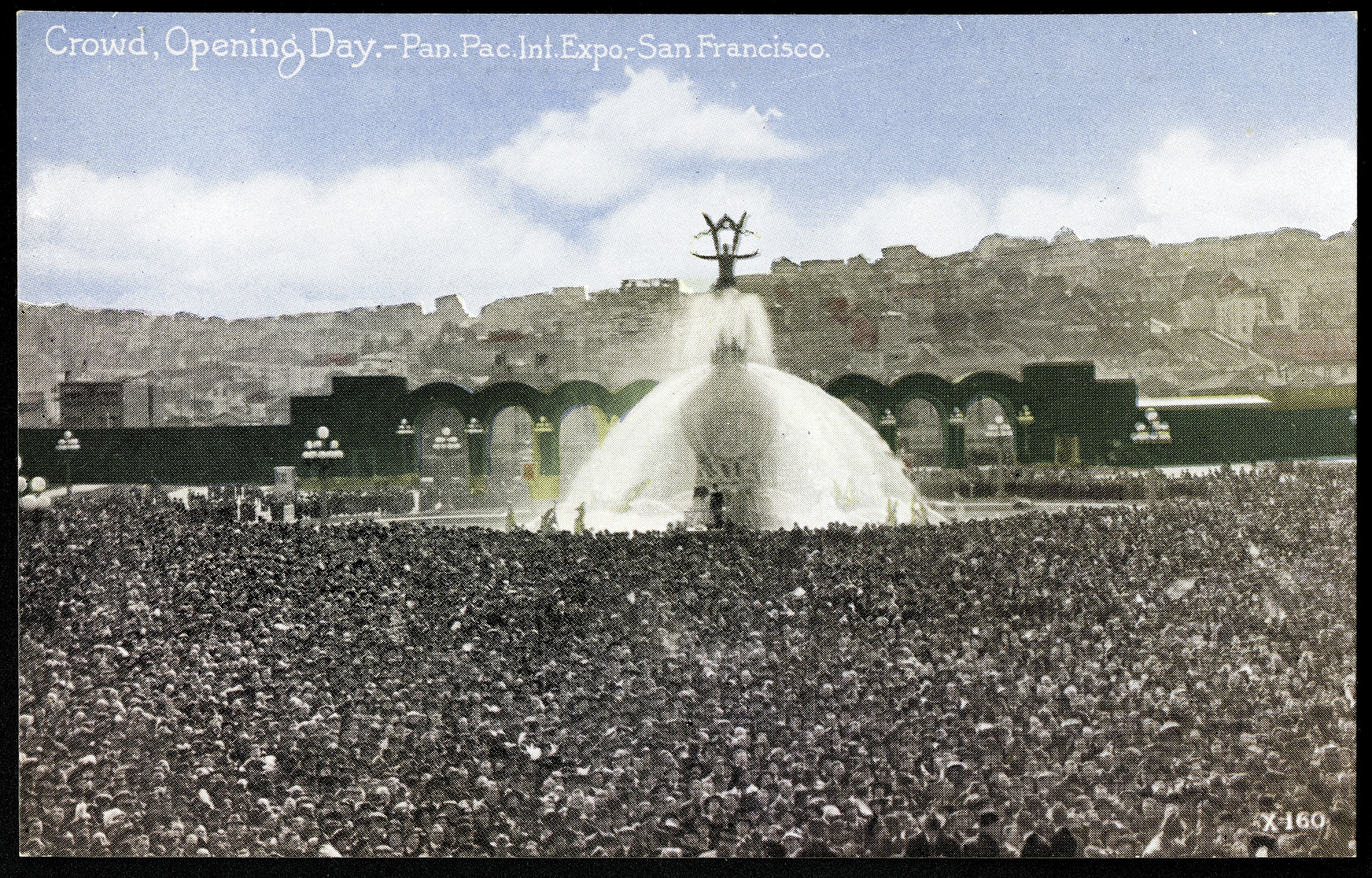 Postcard from the Panama-Pacific Exposition in San Francisco, California. The postcard shows the crowd on opening day. The exposition was intended to illustrate the function and administrative faculty of the Government of the United States and to demonstrate the nature and growth of its institutions, their adaptation to the wants of the people, and the progress of the nation in the arts of peace and war. The Smithsonian Institution contributed an exhibit focusing mainly on ethnology.