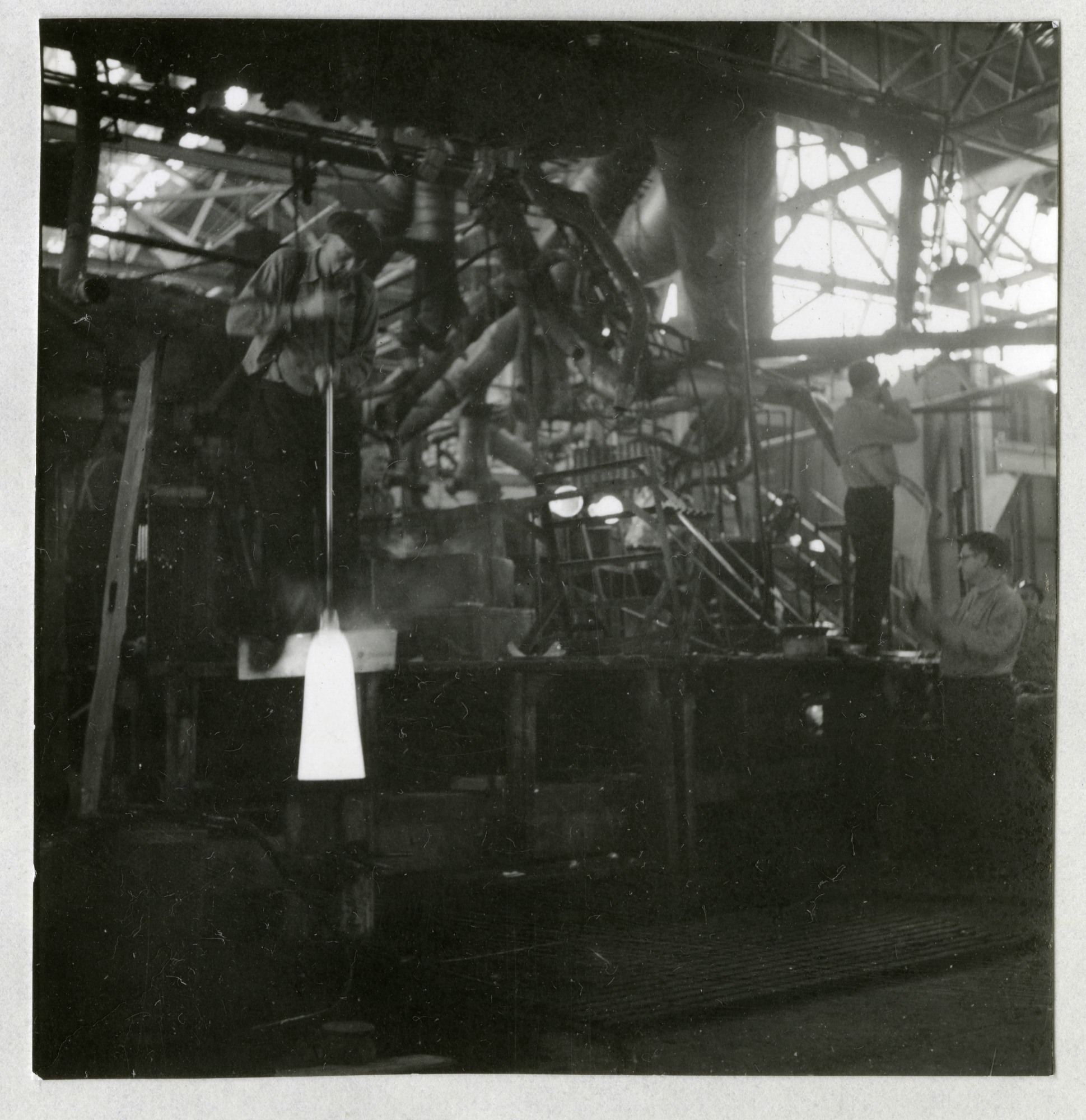 A worker standing on a platform at the Corning Glass Company, a manufacturer of glass and ceramic products for industrial, scientific and technical uses, at Corning, New York, blows through a blowpipe inflating the molten glass to make a glass object. Several other workers can also be seen.