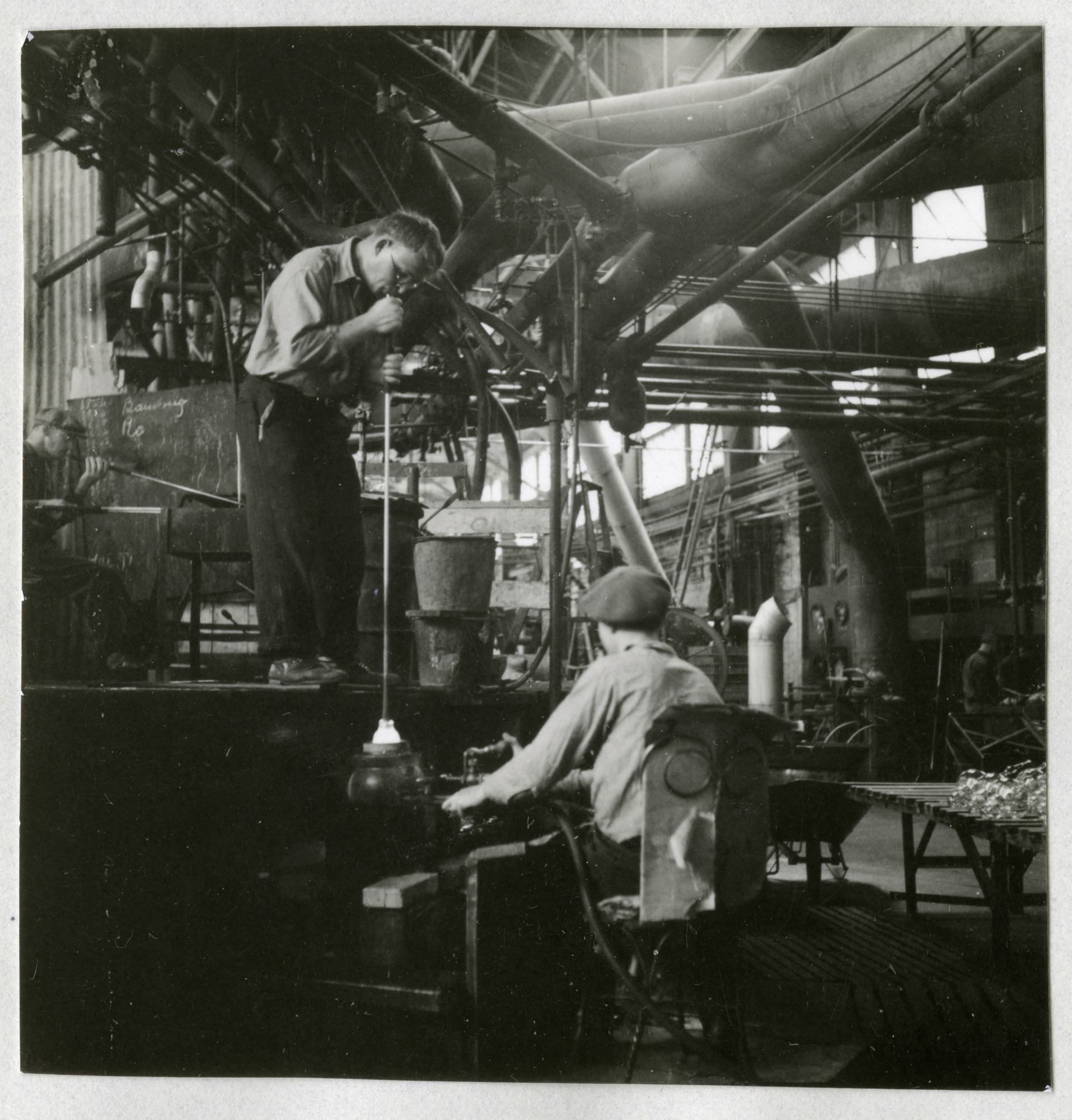 At the Corning Glass Company, a manufacturer of glass and ceramic products for industrial, scientific and technical uses, at Corning, New York, two workers are shown, one standing on a platform using a blowpipe to form a glass object and one seated at a work station.