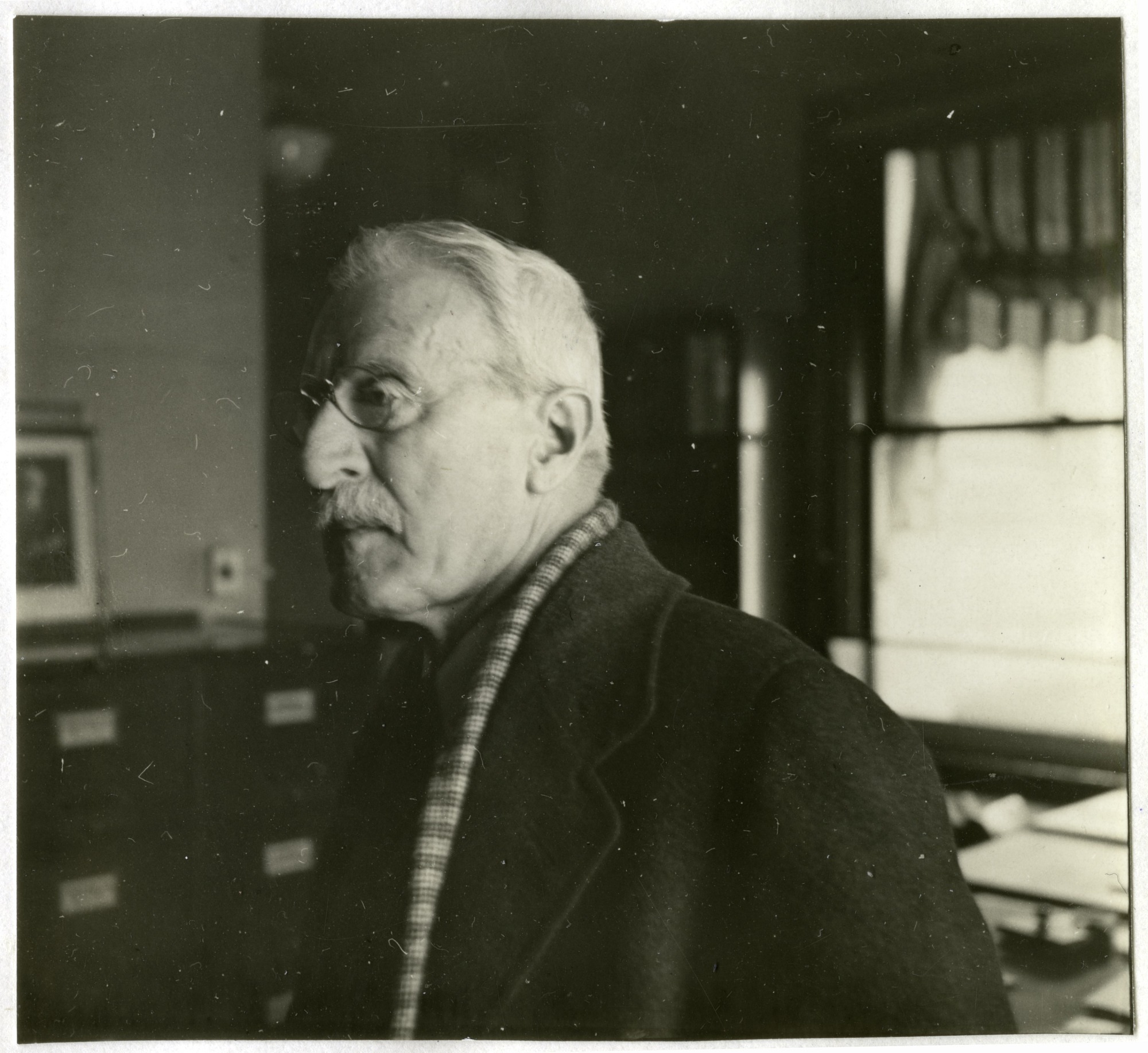 Professor Albert B. Bibb architect and professor of architecture for Catholic University is standing looking to the left. He has on an overcoat with a scarf around his neck. A file cabinet is visible on the left and behind him on the right is a window with an awning. Bibb also served as the architect for the United States Life-Savings Service (later the United States Coast Guard), designed numerous life-saving stations for the agency.