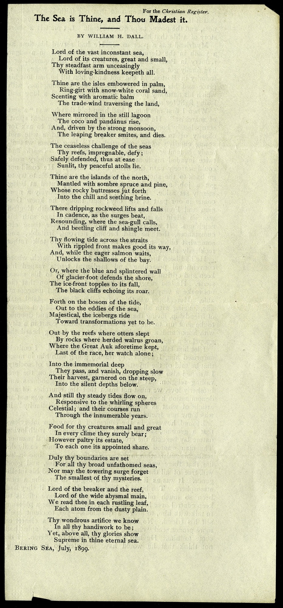 A clipping of the poem "The Sea is Thine, and Thou Madest It," by William Healy Dall. The poem was published in Christian Register on December 14, 1899, but was written by Dall while traveling on the Bering Sea in July of 1899. Dall was a member of, and later led, the Western Union Telegraph Expedition through Alaska from 1865-1868. Dall also was a malacologist with the United States Geological Survey from 1884 to 1925, and served as honorary curator of mollusks at the Smithsonian Institution's United States National Museum from 1880 to 1927.