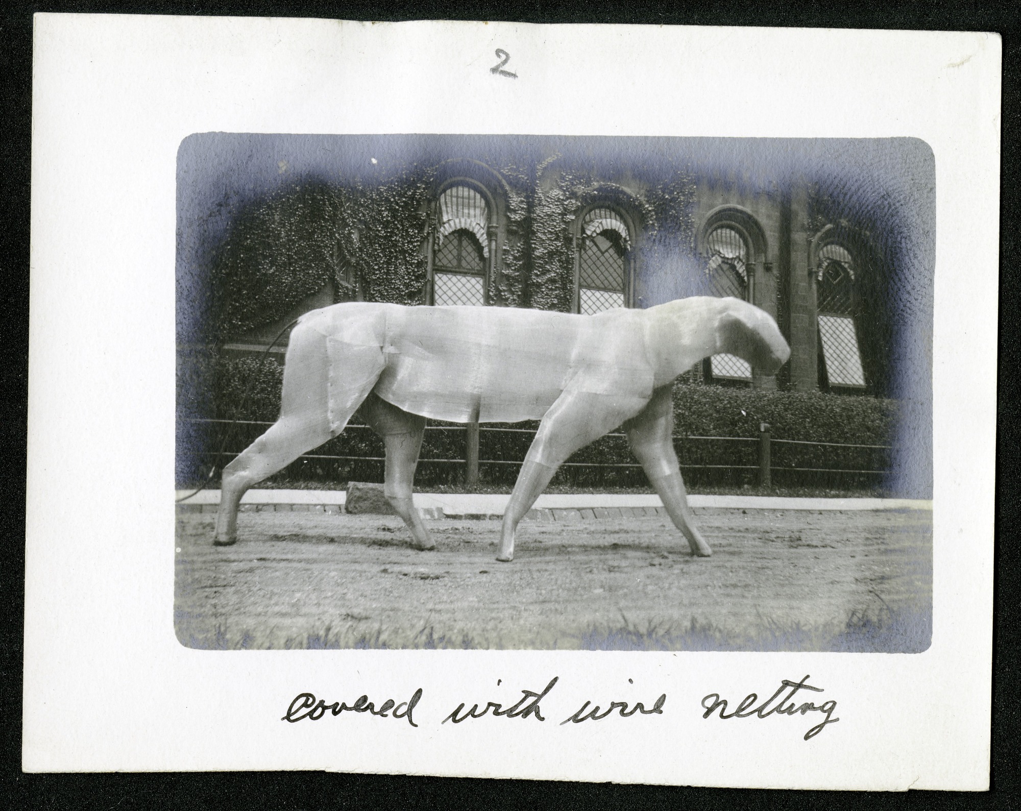 Photograph documenting the process of building a taxidermy frame for a tiger. The frame is standing behind the Smithsonian Institution Building or "Castle." Image 2 of 10 shows the frame covered with wire netting.