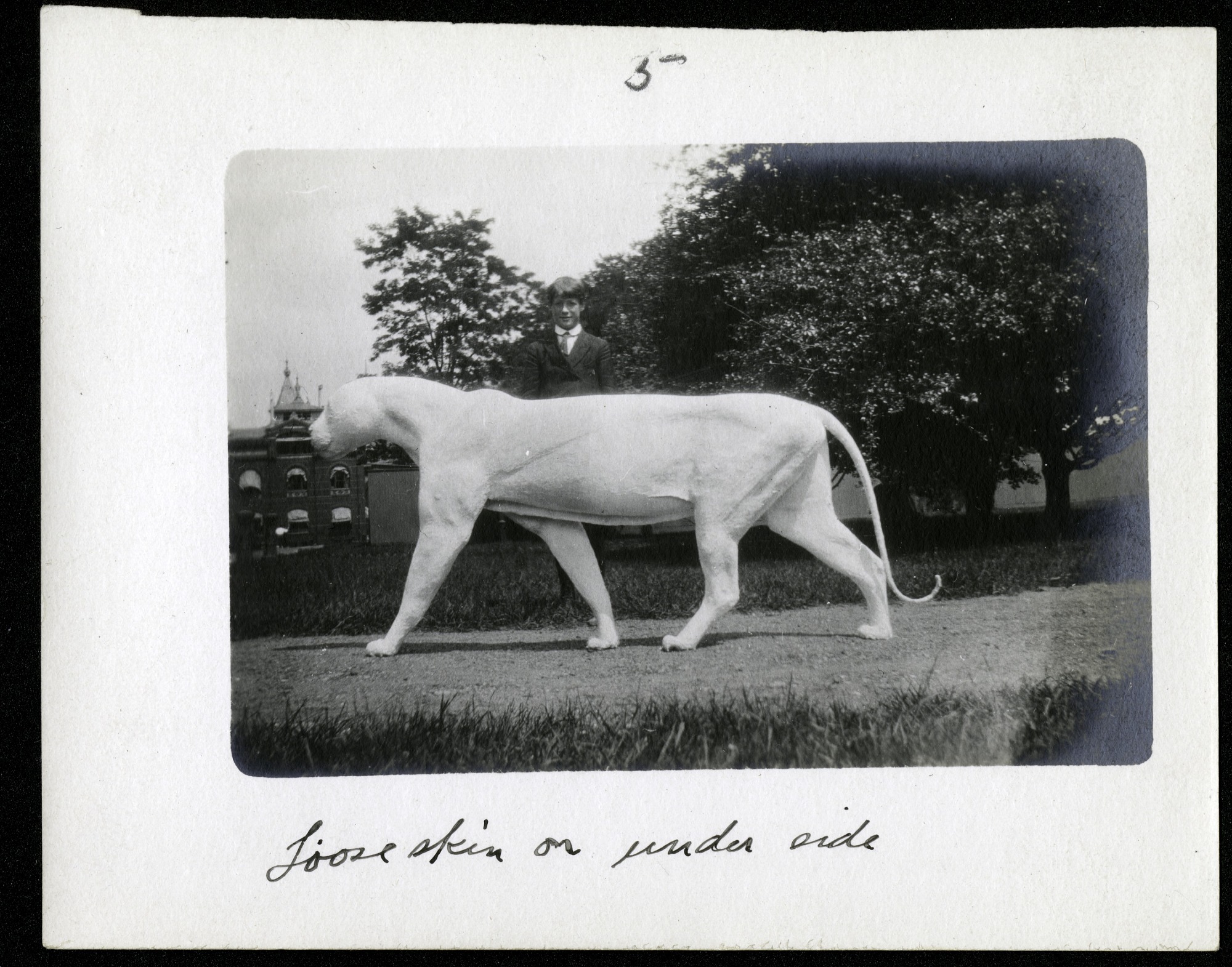 Photograph documenting the process of building a taxidermy frame for a tiger. The frame is standing in the South Yard behind the Smithsonian Institution Building or "Castle," and the Arts and Industries Building is visible in the background. A young boy poses behind the frame. Image 5 of 10 shows the skin attached to the underside.