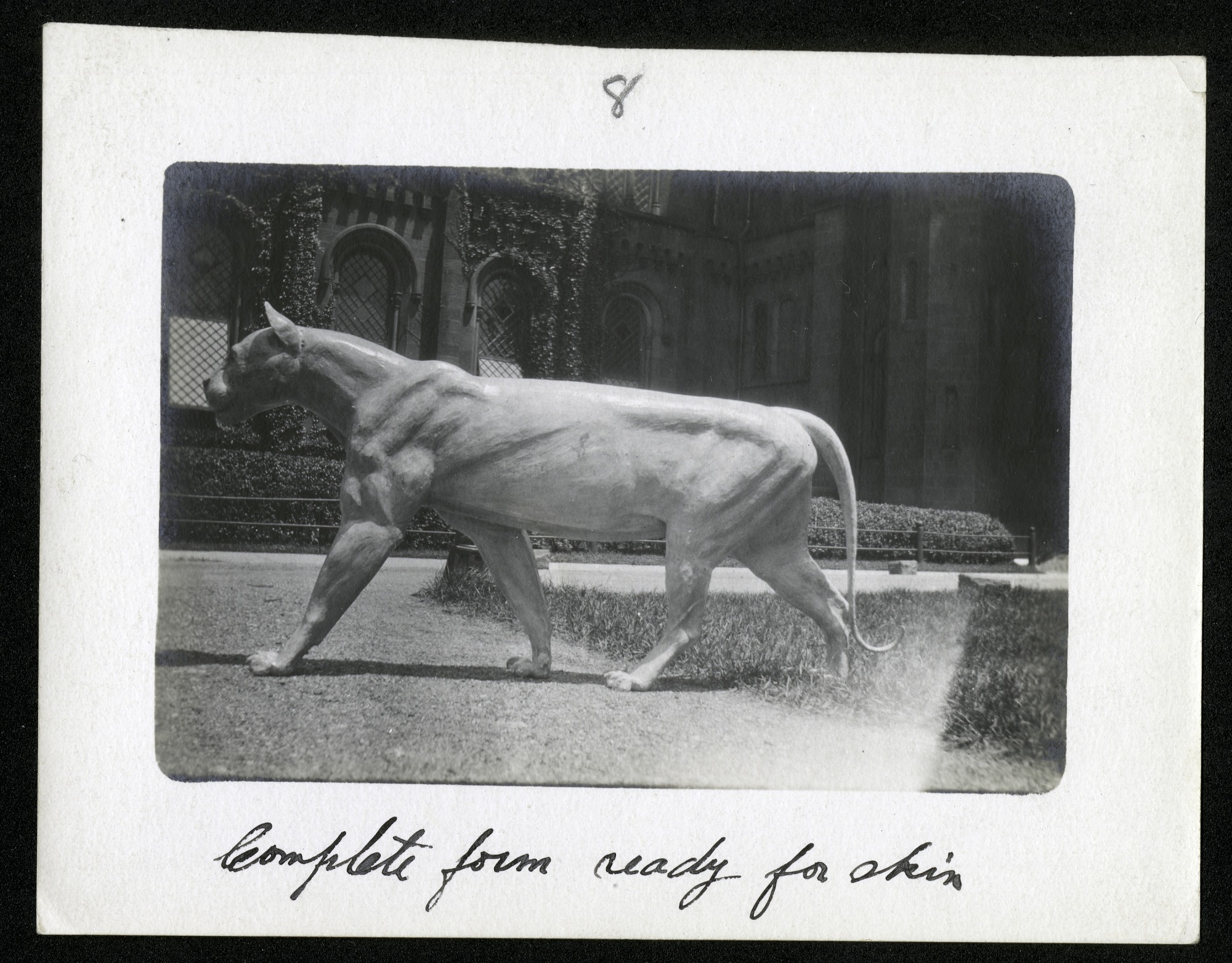 Photograph documenting the process of building a taxidermy frame for a tiger. The frame is standing in the South Yard behind the Smithsonian Institution Building, or "Castle." Image 8 of 10 shows the complete form ready for the skin to be added.