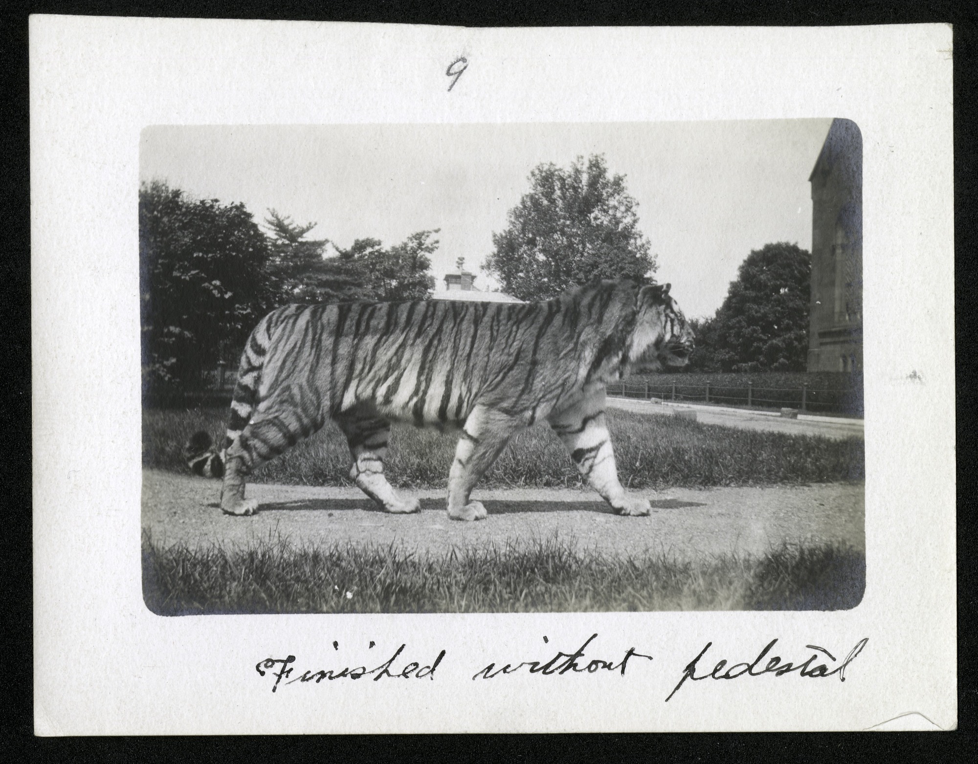 Photograph documenting the process of building a taxidermy frame for a tiger. The frame is standing in the South Yard behind the Smithsonian Institution Building, or "Castle." Image 9 of 10 shows the finished tiger display without its pedestal.