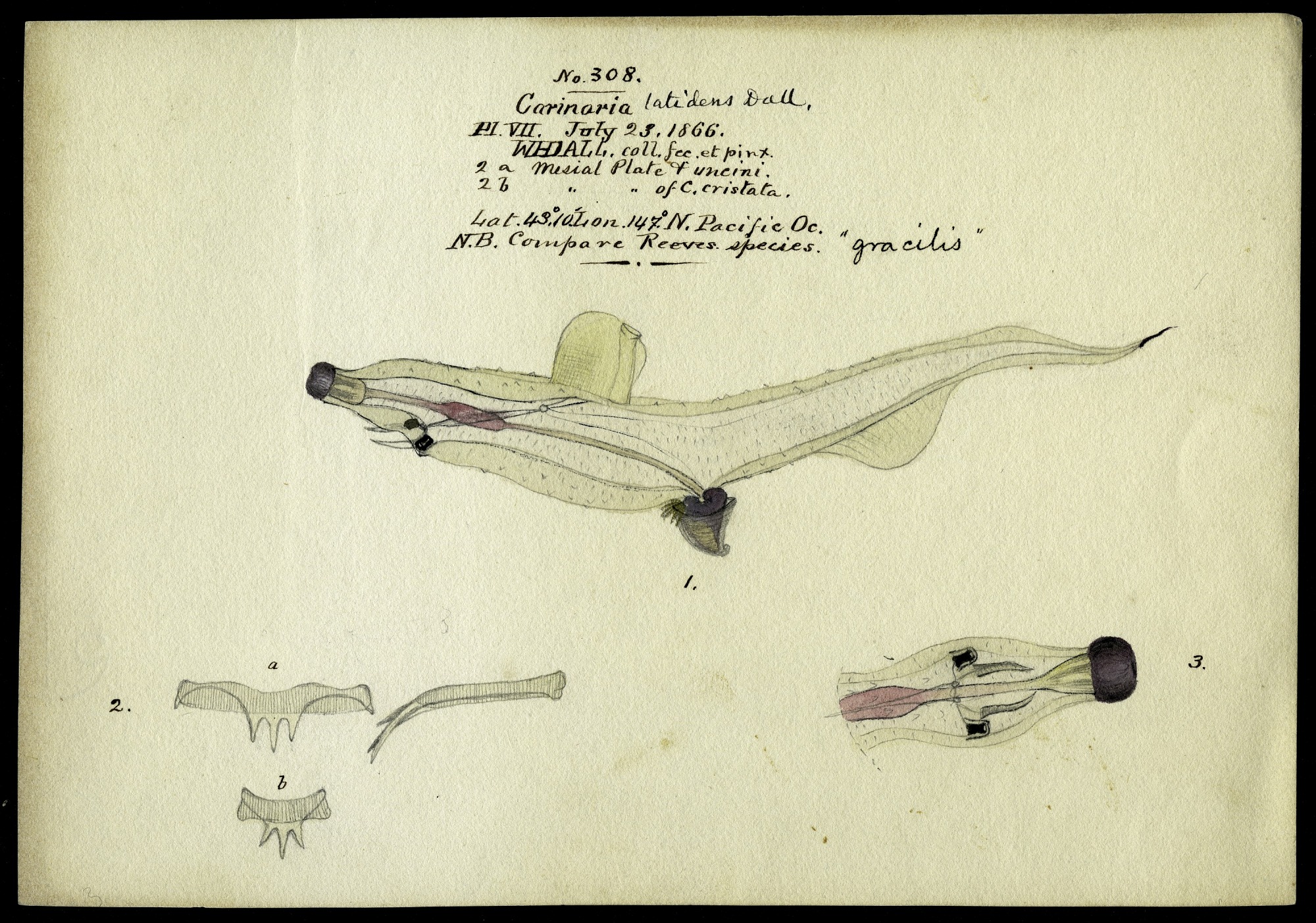 Colored diagram of a mollusk found in the north Pacific Ocean. William Healey Dall made this illustration while a member of the 1866 Western Union Telegraph Expedition to Russian America, the purpose of which was to determine whether a communication system with Europe could be established through what is now Alaska. Dall's scientific career began when he joined the expedition in 1865 as a member of its scientific corps, which was organized by the Smithsonian Institution to collect natural history specimens.