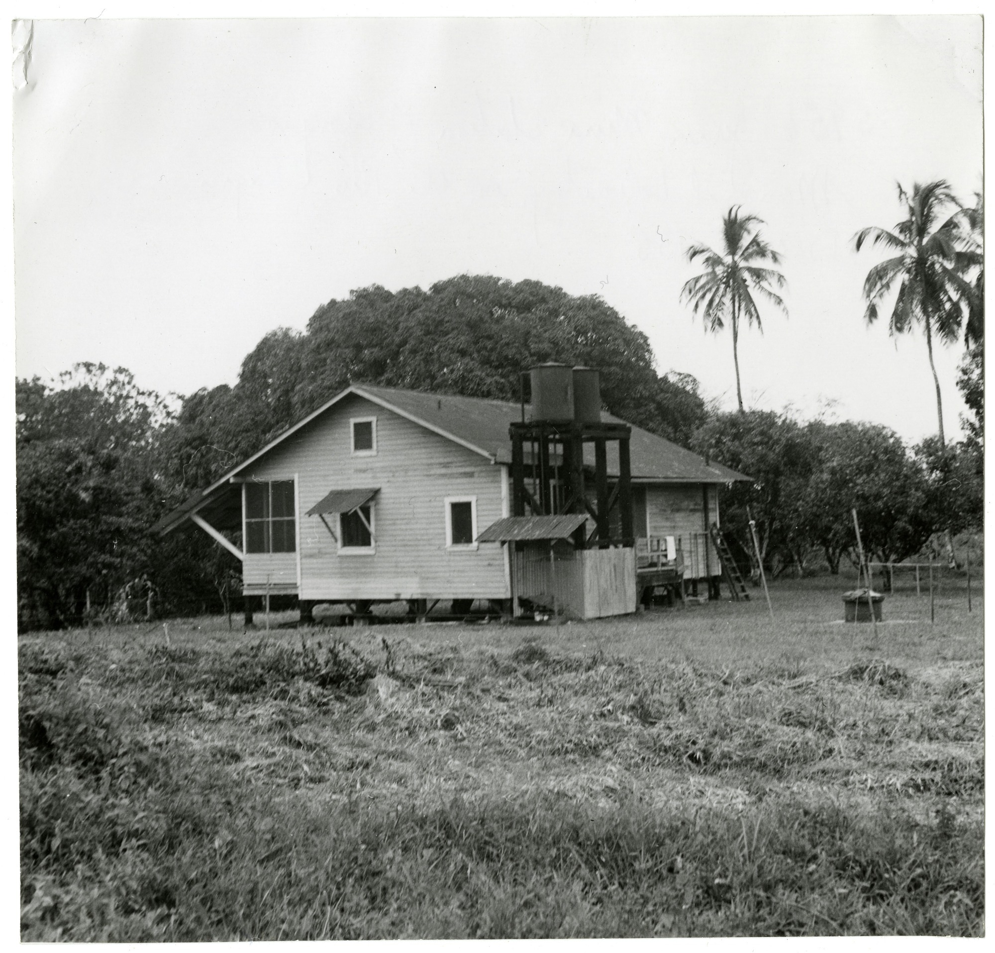 Building is at Juan Mina Station, a small settlement and a former station of the Panama Railroad, located 12.64 miles from Colon, Panama, near the mouth of the Chilibre River on the Chagres River. Now inundated by Gatun Lake. Juan Mina was used as a mosquito collecting field station for entomologists of the Gorgas Memorial Laboratory for many years.