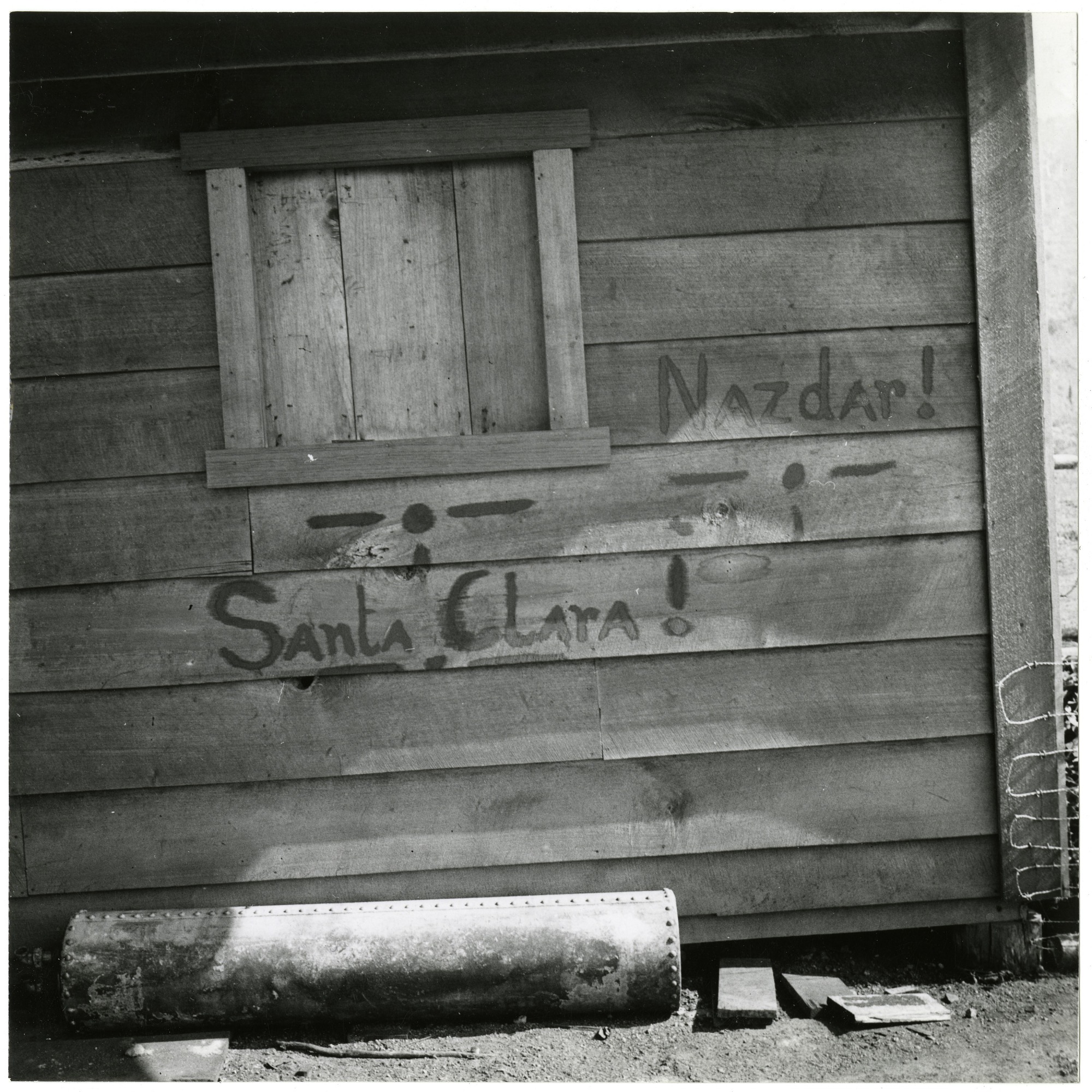 The exterior wall of a house, used by Smithsonian Secretary Alexander Wetmore, while doing ornithological field work in Santa Clara, Chiriquí, Panama, that has an inscription with the words "Santa Clara!" and "Nazdar!" (Hello in Czech) written by Alois Hartmann.