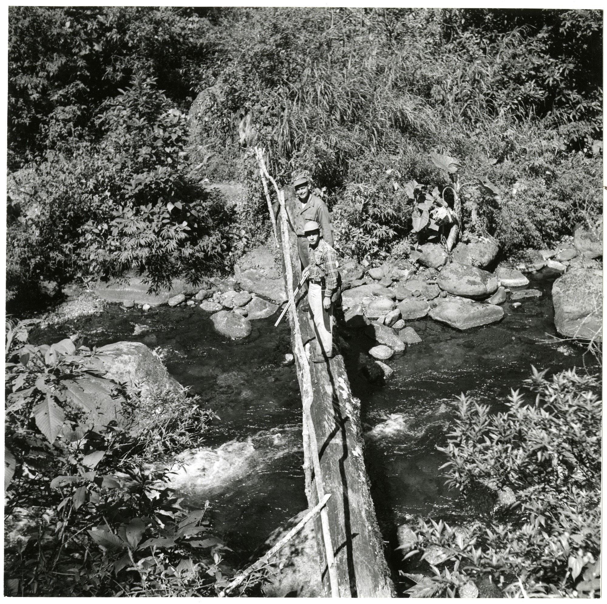 Gordon Field and Gedon (Armagedón) Hartmann stand on a log foot bridge across the Rio Colorado, Western Chiriquí, Panama.