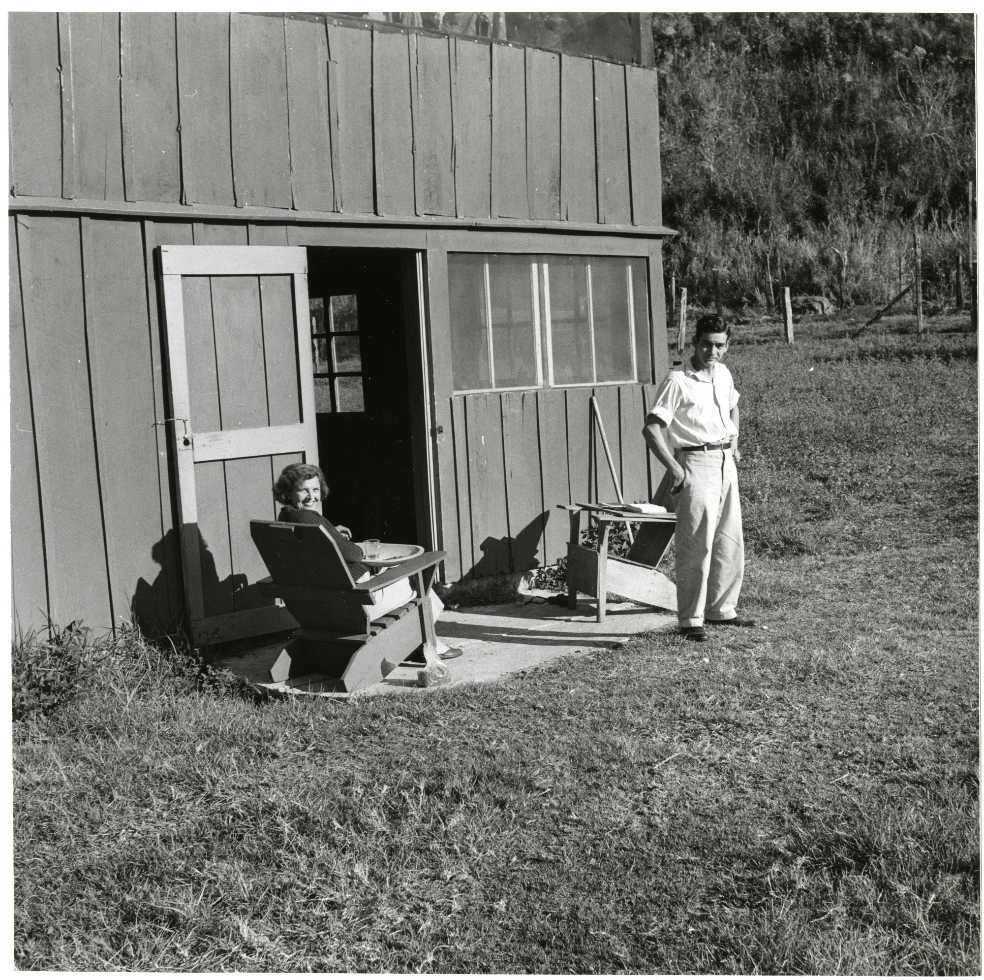Bea Wetmore (seated) and Gedón (Armagedón) Hartmann (standing) are outside a doorway to the Wetmore's house, Palo Santo, Chiriquí, Panama.