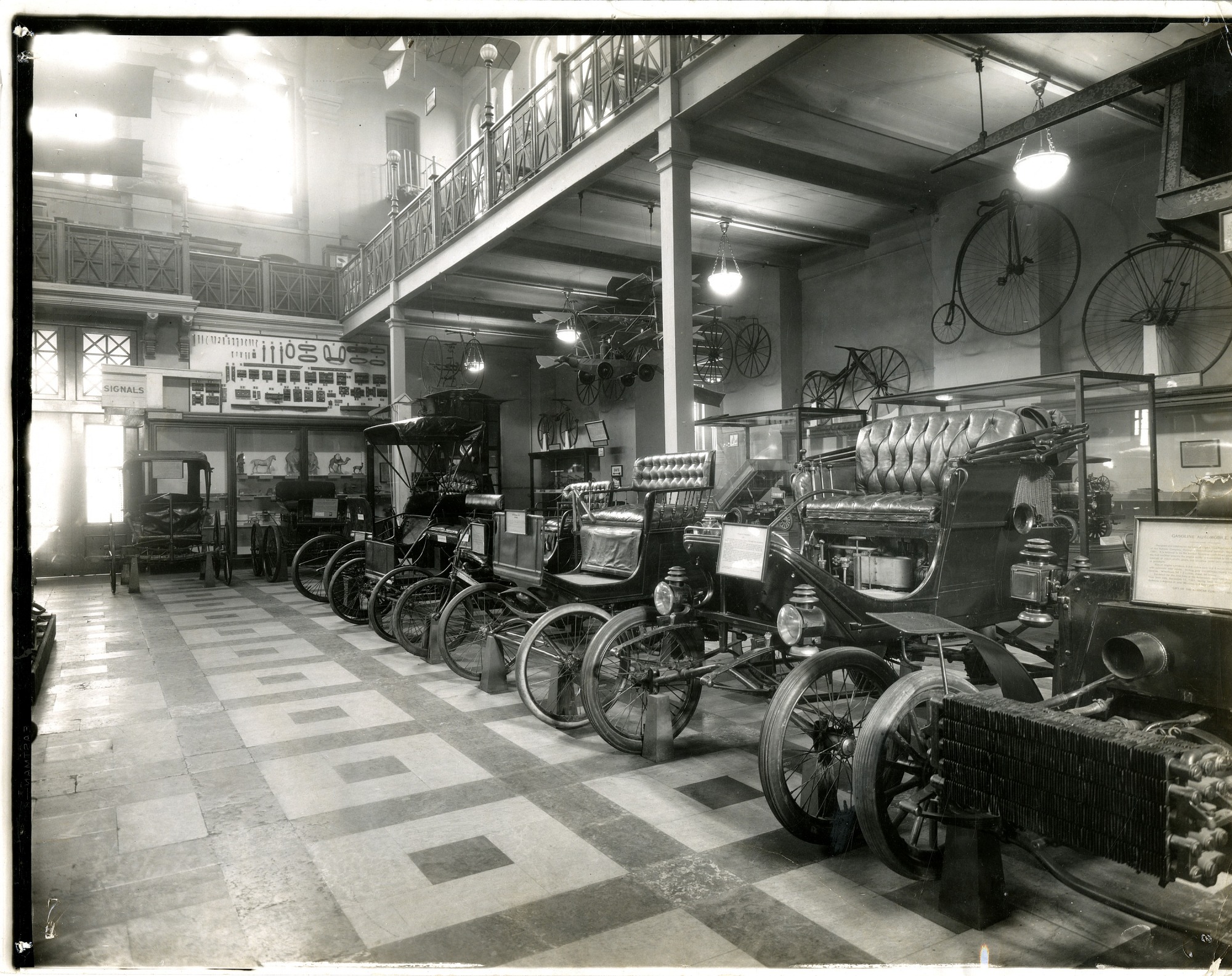 Part of the early automobiles collection in the United States National Museum, now the Arts and Industries Building. Cars are lined up, facing the exhibit hall, and bicycles can be seen hanging from the wall. The iron railings of second floor balconies are shown.