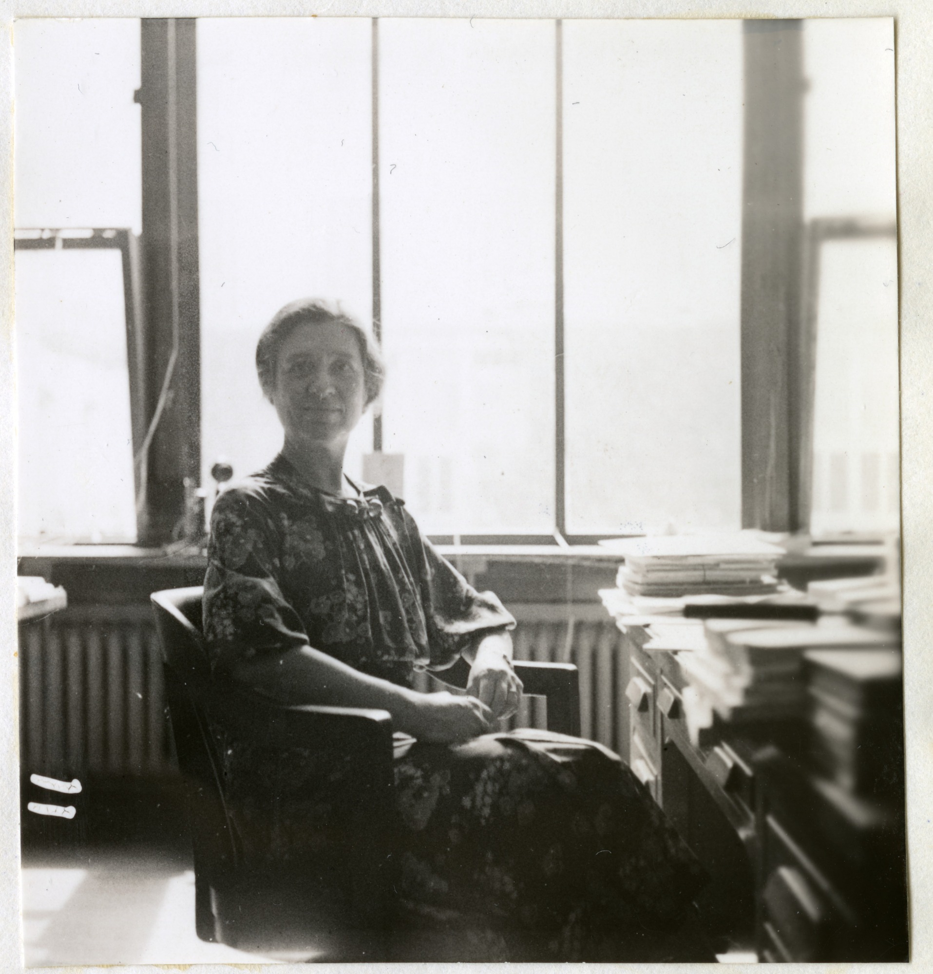 Leila Forbes Clark sits at a desk in front of a window, facing the camera.