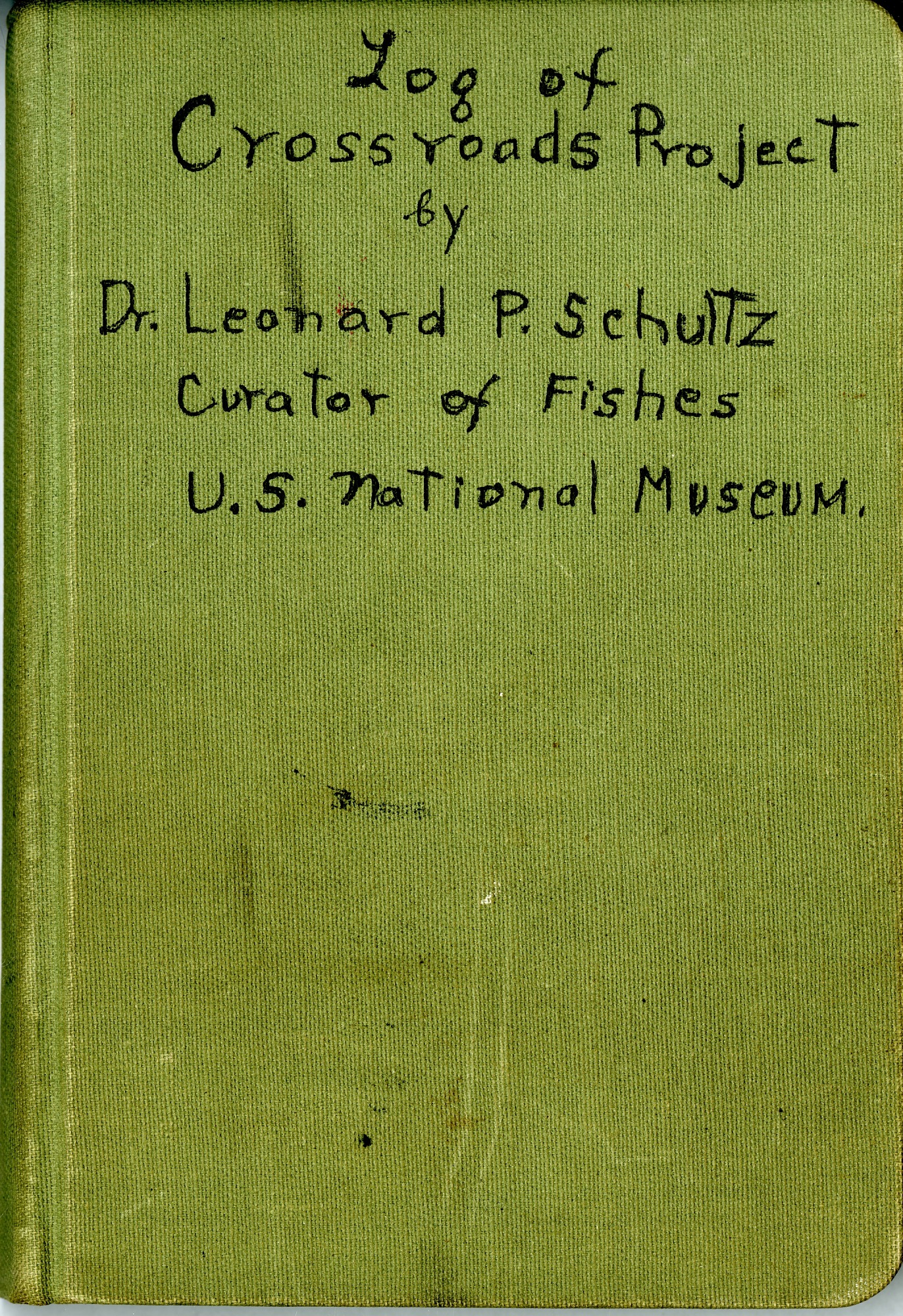 Cover of Dr. Leonard P. Schultz's Log of Operation Crossroads. The cover reads "Log of Crossroads Project by Dr. Leonard P. Schultz Curator of Fishes U.S. National Museum."