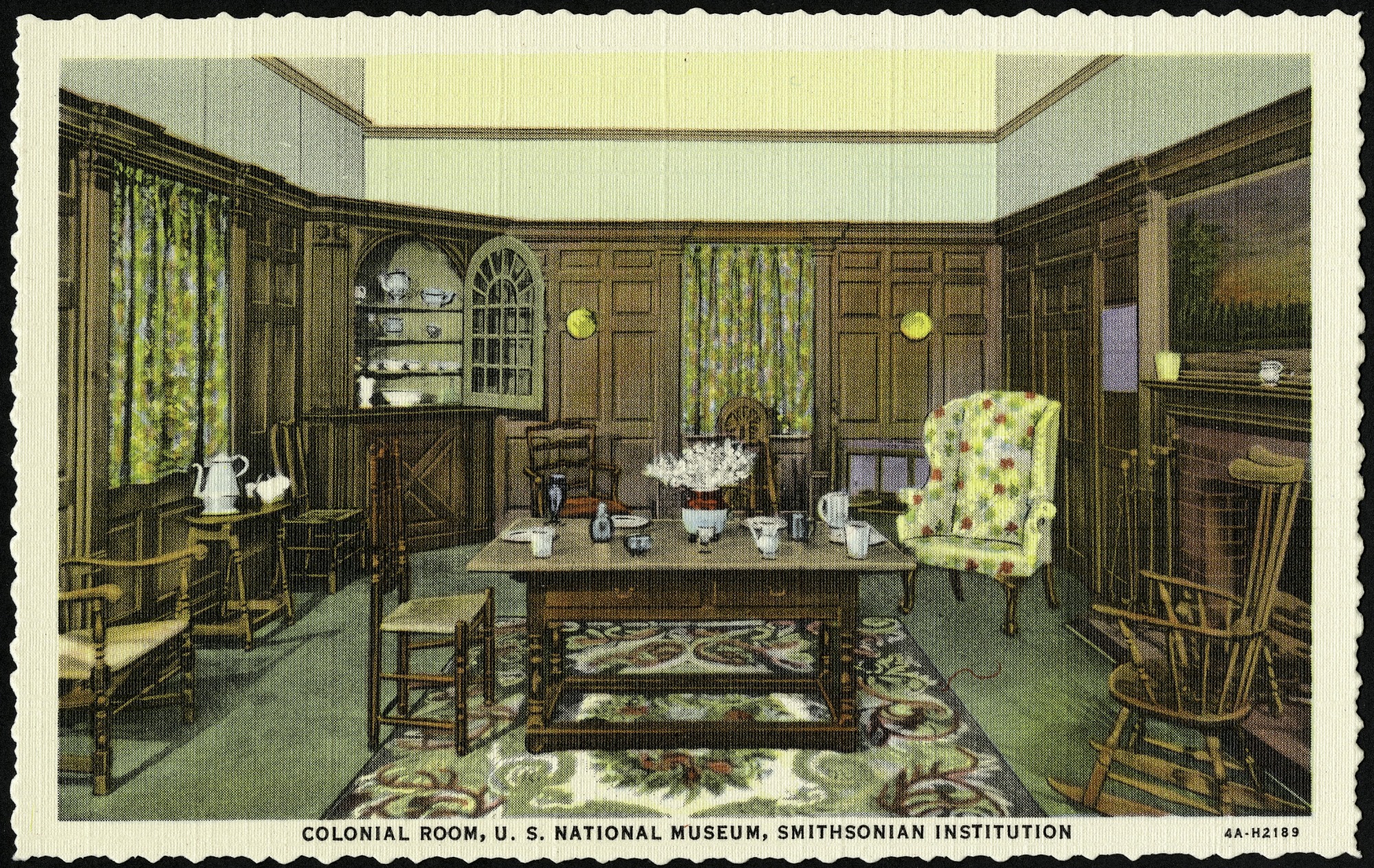 Postcard of the Colonial Room in the United States National Museum, now the National Museum of Natural History. Chairs are positioned around the perimeter of the room, and a table with various wares on it is in the center. Much of the wall is wood-panelled. The message side is blank. The front has white edging.