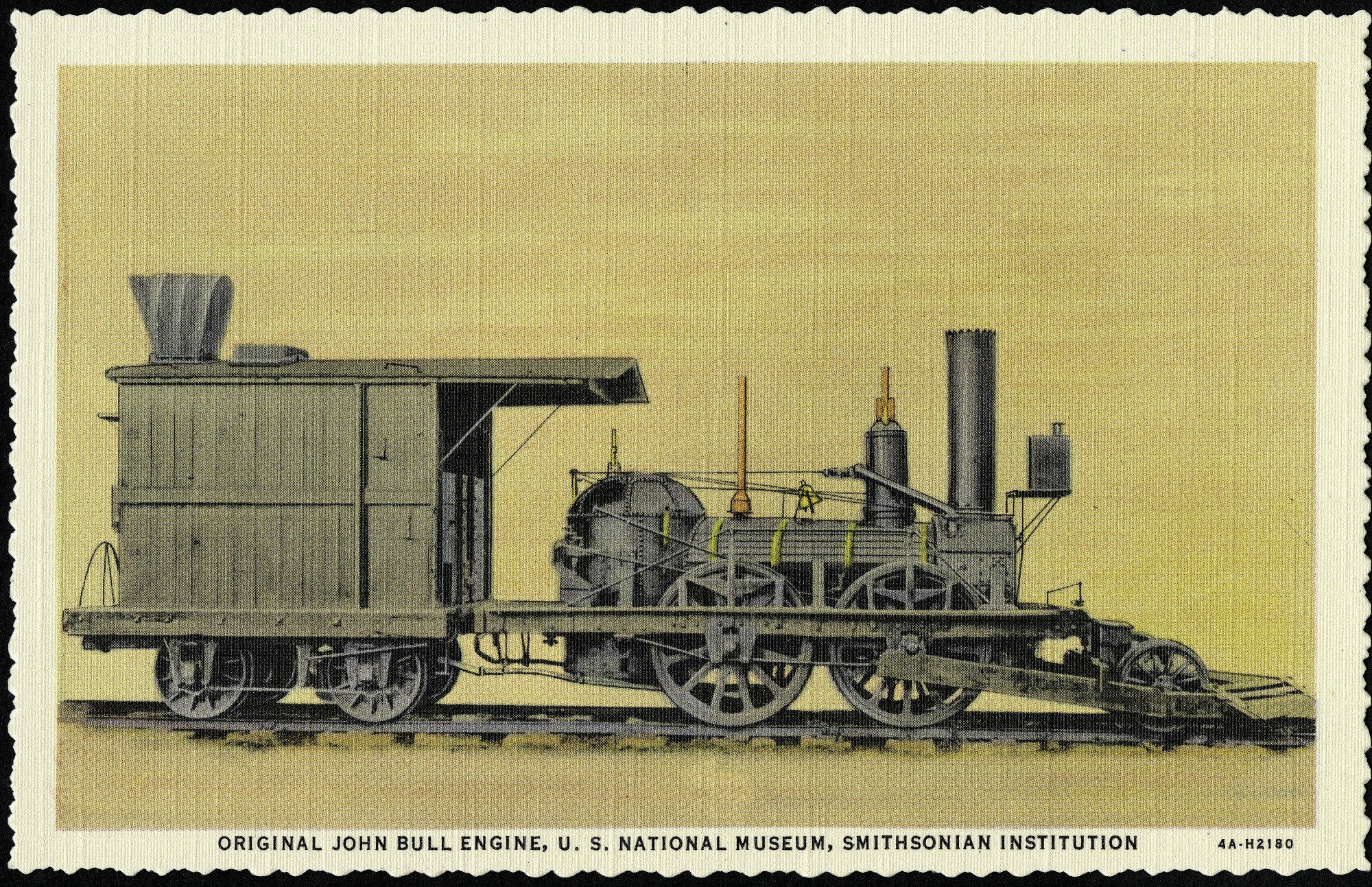 Postcard of the original John Bull Engine which was exhibited at the United States National Museum, now the Arts and Industries Building. The postcard shows the engine on a railroad track, against an orange background. The message side is blank, and the card has white edging.