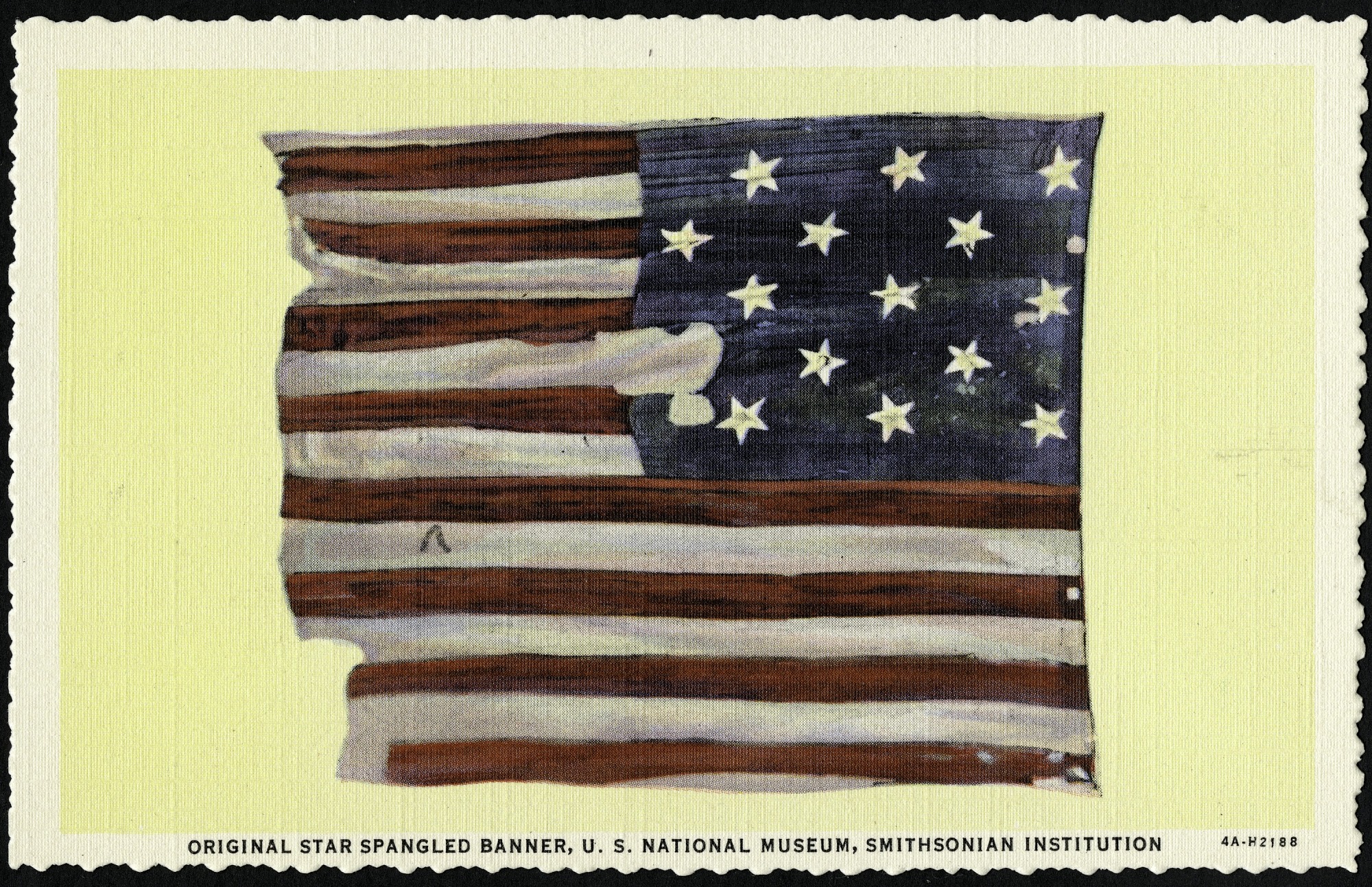 Postcard of the original Star-Spangled Banner which at the time was hanging in the United States National Museum, now the Arts and Industries Building. It is shown against a yellow background, and the front has white edging. The message side is blank.
