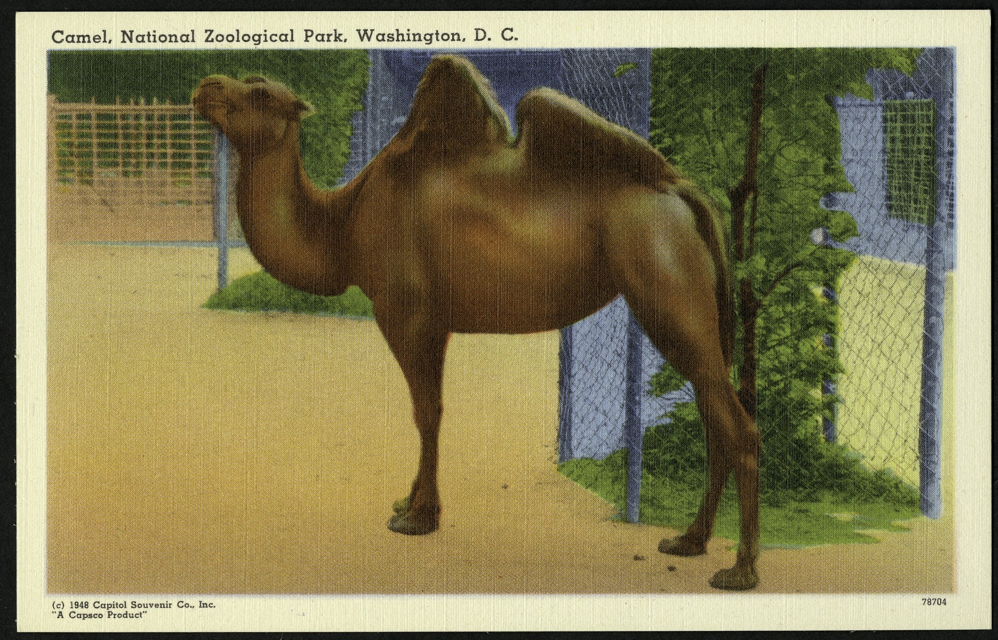 Blank postcard of a camel at the National Zoological Park. The camel is standing in front of trees surrounded by fences. The message side is blank, but it has a printed note: "Camel--The "Bactrian" Camel [is] distinguished by two humps. Its native home was Central Asia. It is an important beast of burden in Southern Siberia and in Mongolia. The "Arabian" Camel is larger than the "Bactrian" Camel and has only one hump. It is one of the oldest of Domestic Animals; it will carry a load of 500 pounds 25 miles a day without drinking. Camels live up to 50 years." The front has a white border.