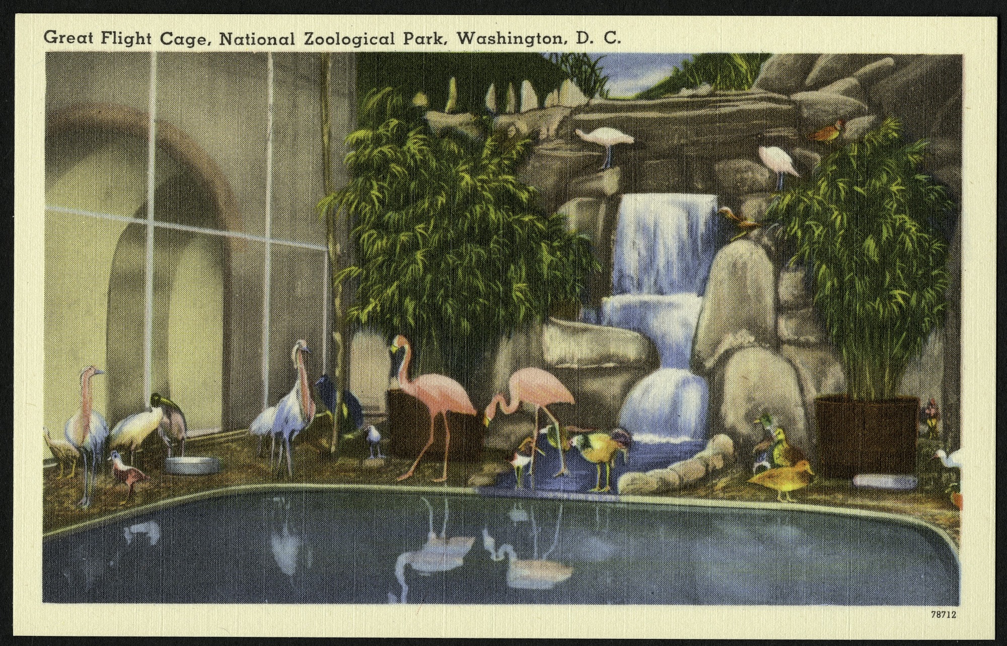 Blank postcard of the Great Flight Cage at the National Zoological Park. Various birds are perched beside a waterfall and the pool below it. The message side is blank, but it has a printed note: "Great Flight Cage--A group of Great Birds in all their majestic and colorful splendor." The front has a white border.