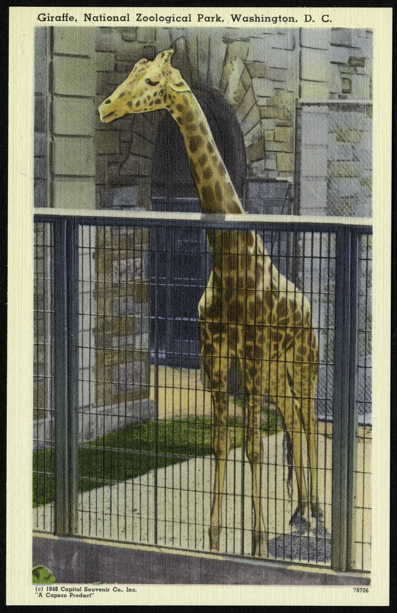 Blank postcard of a giraffe at the National Zoological Park. The giraffe is standing in its enclosure. The message side is blank, but it has a printed note: "Giraffe--The tallest of all mammals sometimes growing to a height of 20 feet. Inhabit open country and brouse [sic] on tall trees. Can gallop at over 30 miles an hour. Found only in Africa, south of the Sahara Desert." The front has a white border.
