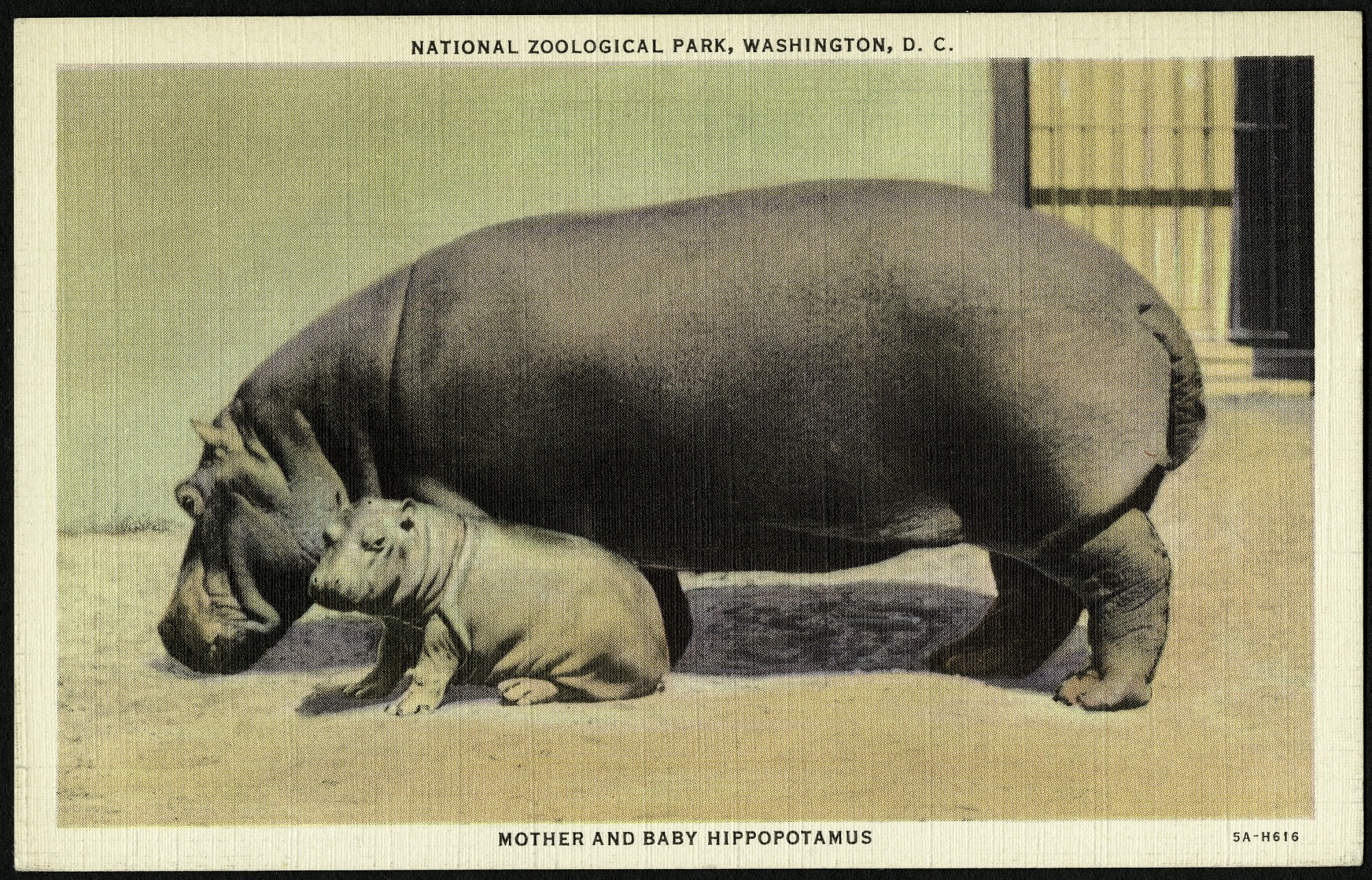 Blank postcard of a mother and baby hippopotamus at the National Zoological Park. The baby hippopotamus is sitting on the ground next to its mother, who is standing up. The message side is blank, but it has a printed note: "Five babies were born to this Hippopotamus during her life in the zoo." The front has a white border.