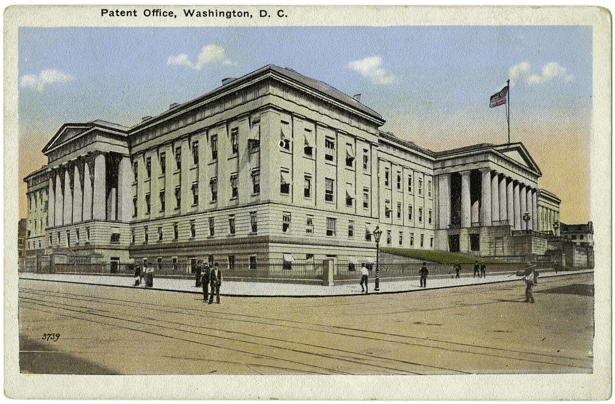 Postcard of the Patent Office Building shows people walking in front of the building and on the street. The message side is unused, but it has a short printed note about the building: "U.S. Patent Office. The Department of the Interior building is popularly called the Patent Office." The front of the postcard has a white border.