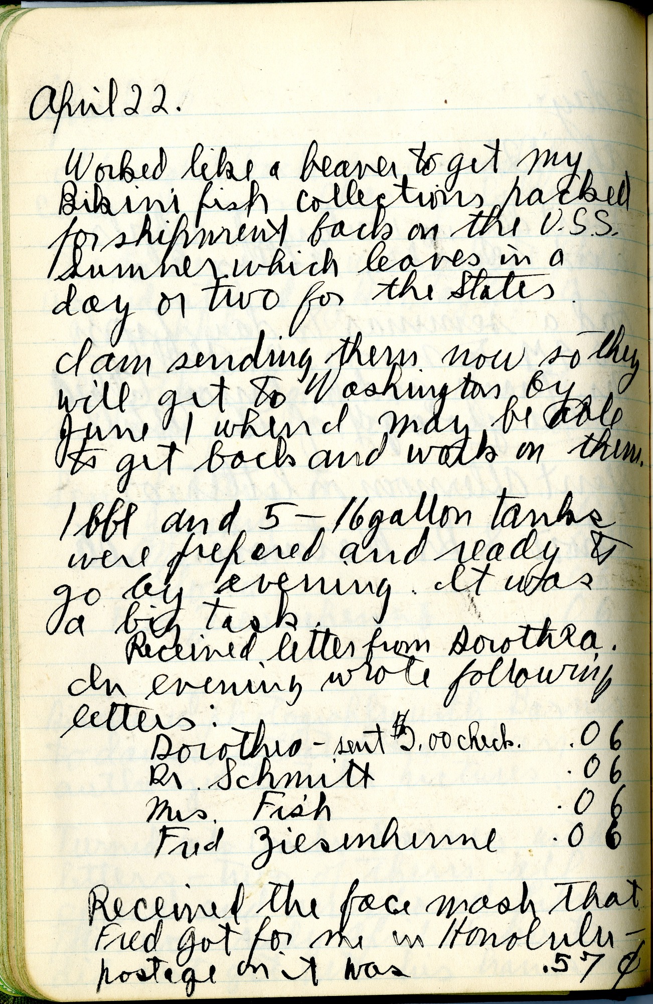 Schultz records that he "worked like a beaver" in order to get his fish specimens from Bikini packed to be shipped to the United States on the U.S.S. Sumner so that they would "get to Washington by June 1 when [he] may be able to get back and work on them." After detailing some of the specifics of this shipment, he turns to more personal matters, taking note of the letters that he received and posted.