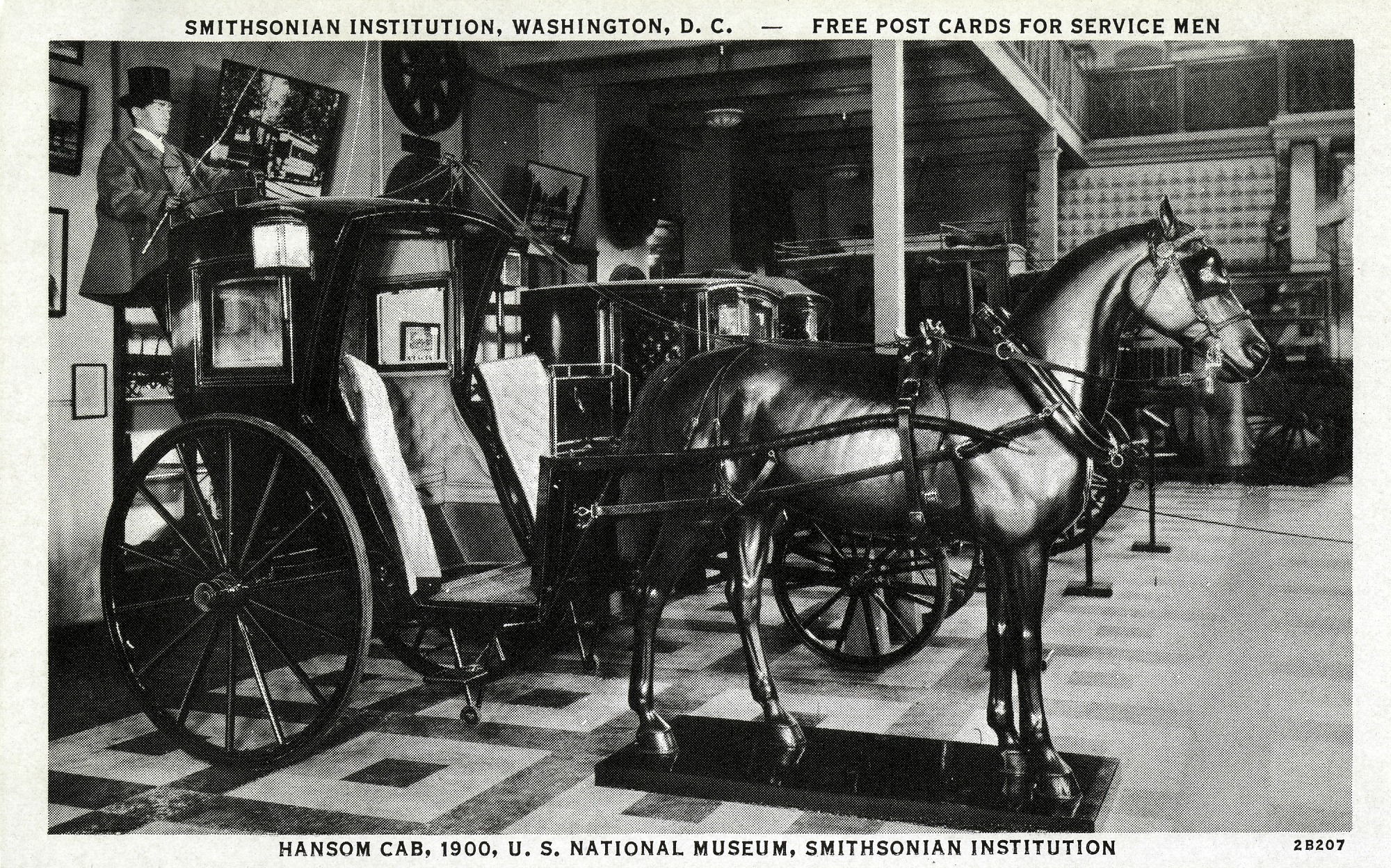 Grayscale postcard of a horse-drawn Hansom Cab, part of the Transportation exhibit, on display in the U.S. National Museum, now the Arts and Industries Building. The postcard is labelled as one of the "Free Post Cards For Service Men." The message side is unused, and the front has a white border.