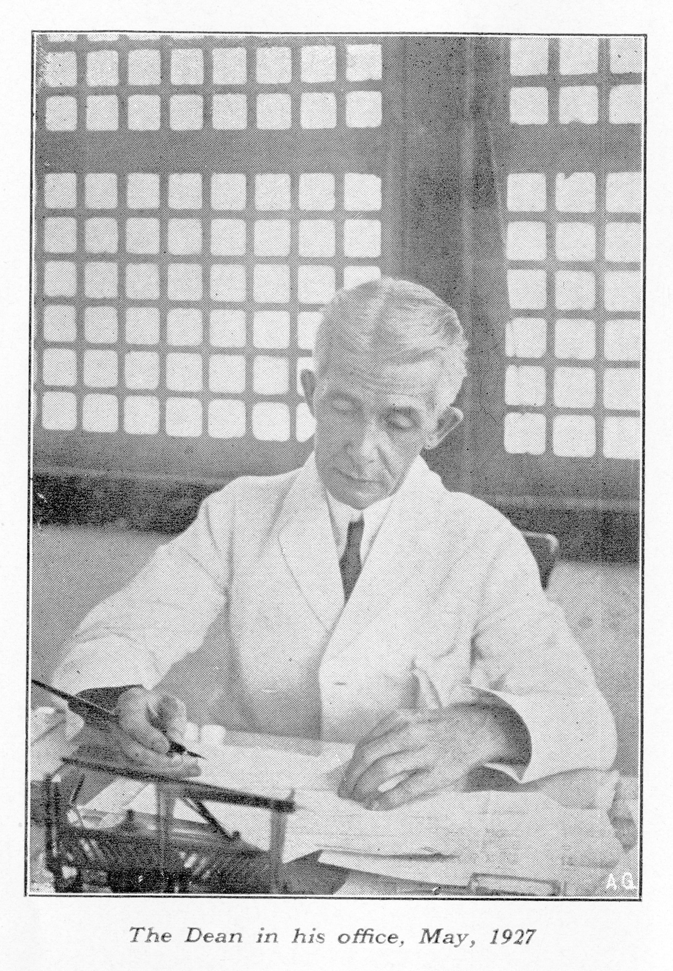Image of Charles Fuller Baker (1872-1927) working at his desk in his office at the University of the Philippines. The caption reads, "The Dean in his office, May, 1927."