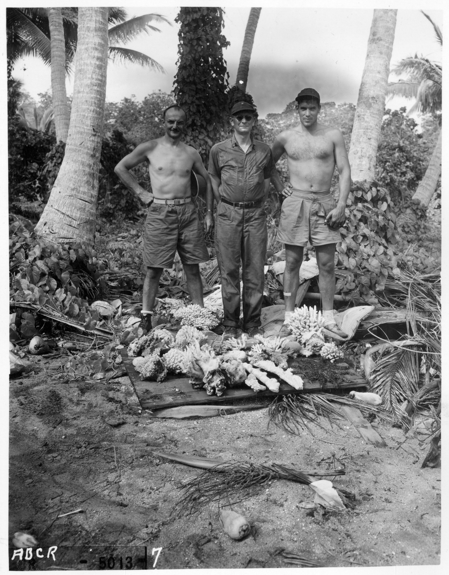 Geologist J. I. Tracy (far left) of the USGS, Geologist J. Harlan Johnson (center) of the USGS and the Colorado School of Mines and an unidentified member of the expedition pose with some of the coral specimens collected during Operation Crossroads in 1947.