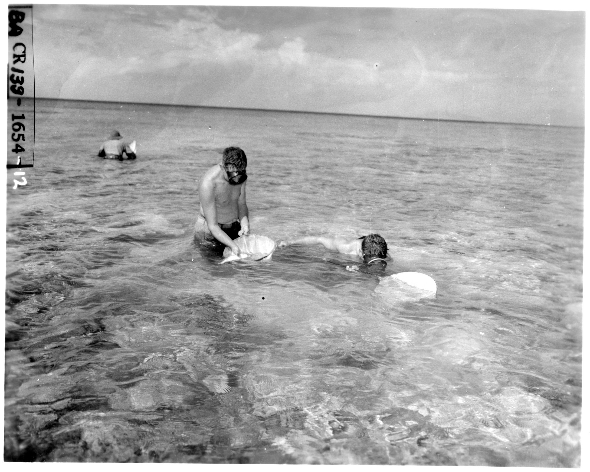 Scientists wearing swim goggles swim around in the shallow waters of the atoll collecting specimens.