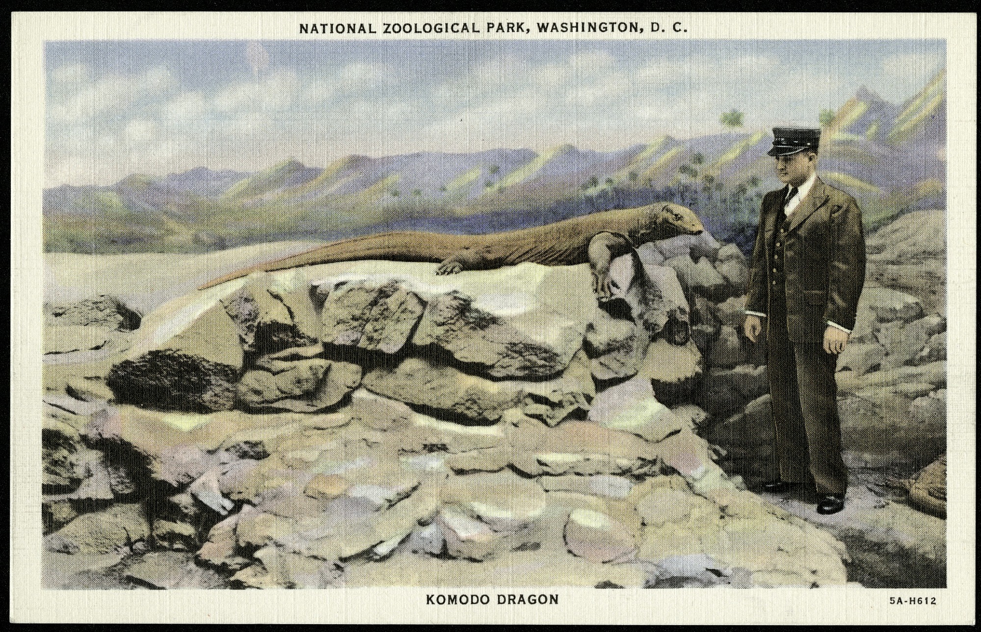 Color postcard of a Komodo Dragon at the National Zoological Park. The Komodo Dragon is sitting on top of a pile of rocks, and a zoo employee is standing to its right. The front of the postcard has a white border. The postcard is unused, but the message side has a printed note: "Komodo Dragon, a young specimen of the largest of all Lizards."