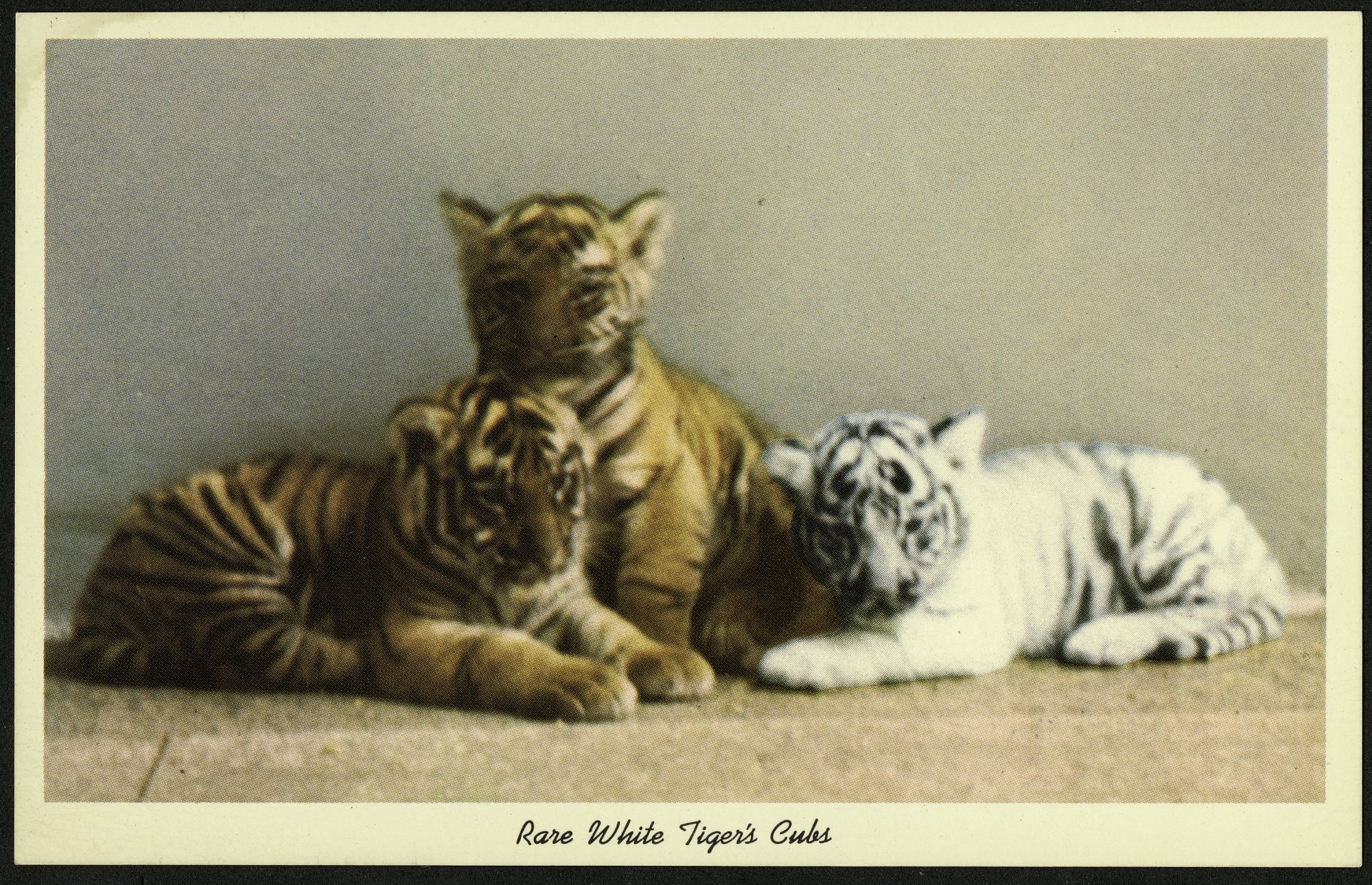 Color postcard of three cubs of a white tiger at the National Zoological Park. The front of the postcard has a white border. The postcard is unused, but the message side has a printed note about the white tiger: "The first white tiger bred outside of India, is shown with his normal-color litter-mates. The tiger triplets are the first born to Samson and Mohini Rewa, the National Zoo's rare white tiger."