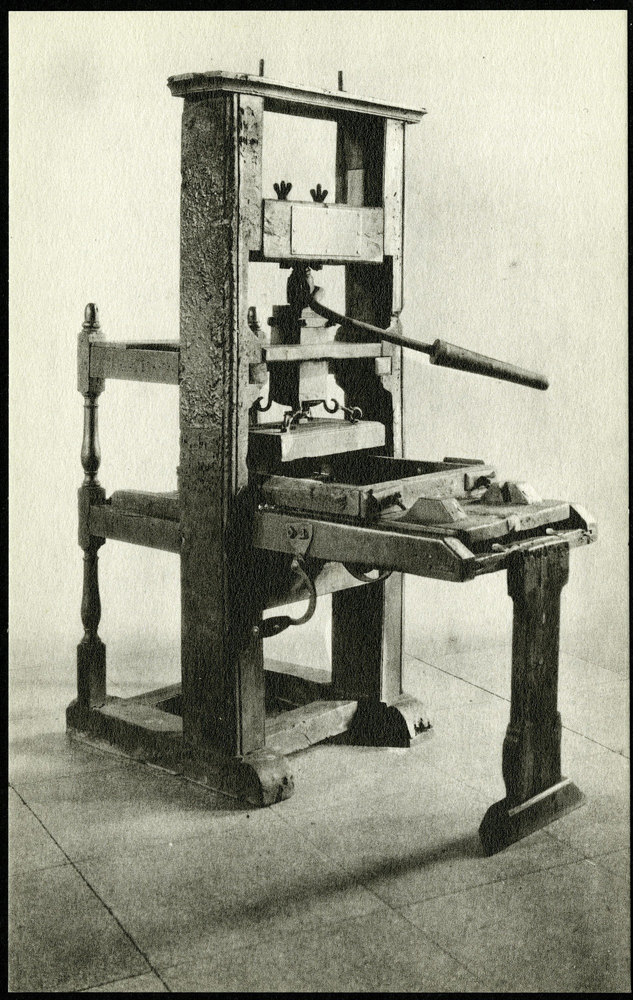 Grayscale postcard of the Franklin Press on exhibit at the United States National Museum, now known as the Arts and Industries Building. The postcard is unused, but the message side has a printed note about the press: "This 'Improved Wooden Press' was used by Benjamin Franklin when employed in London as a printer by John Watts in 1726. The press passed to Cox and Sons, who sold it to Messrs. Harrild & Sons, who in turn presented it to John B. Murray of New York, in 1842. That same year it was deposited in the Patent Office, where it remained, except for six months in 1876, until 1883, when it was moved to the US National Museum. This type of printing press was in general use from about 1690 until after 1800, when it was superseded by the more powerful iron press."