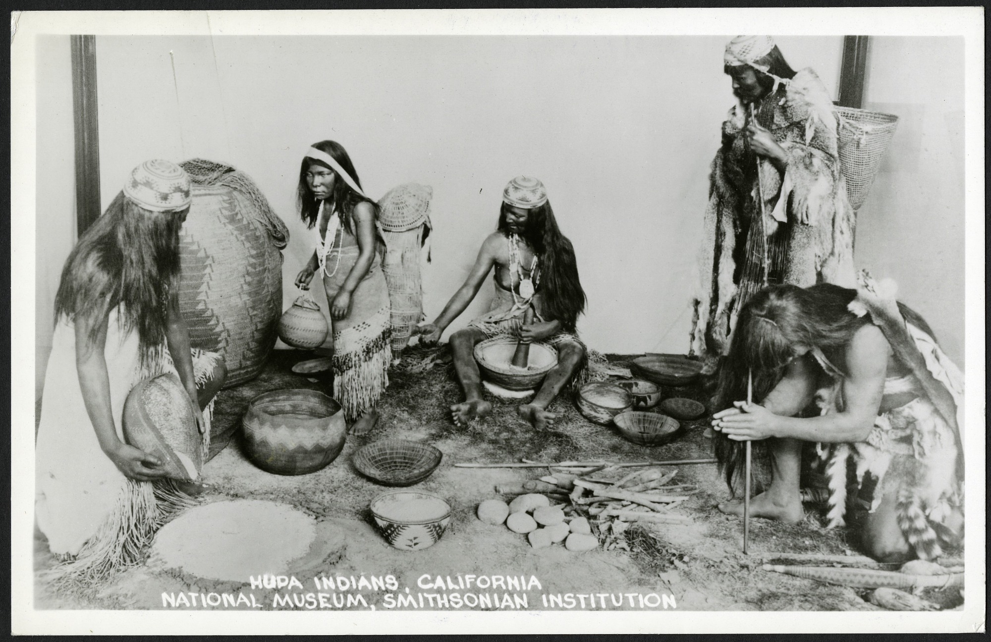 "Real photo" postcard of an exhibit of Native American Hupa Indians at the United States National Museum, now the National Museum of Natural History. The exhibit caption reads "Hupa Indians, California, National Museum, Smithsonian Institution." The exhibit shows models of five Native Americans, and each appears to be engaged in different tasks preparing food. The postcard is unused, and its front has a white border.
