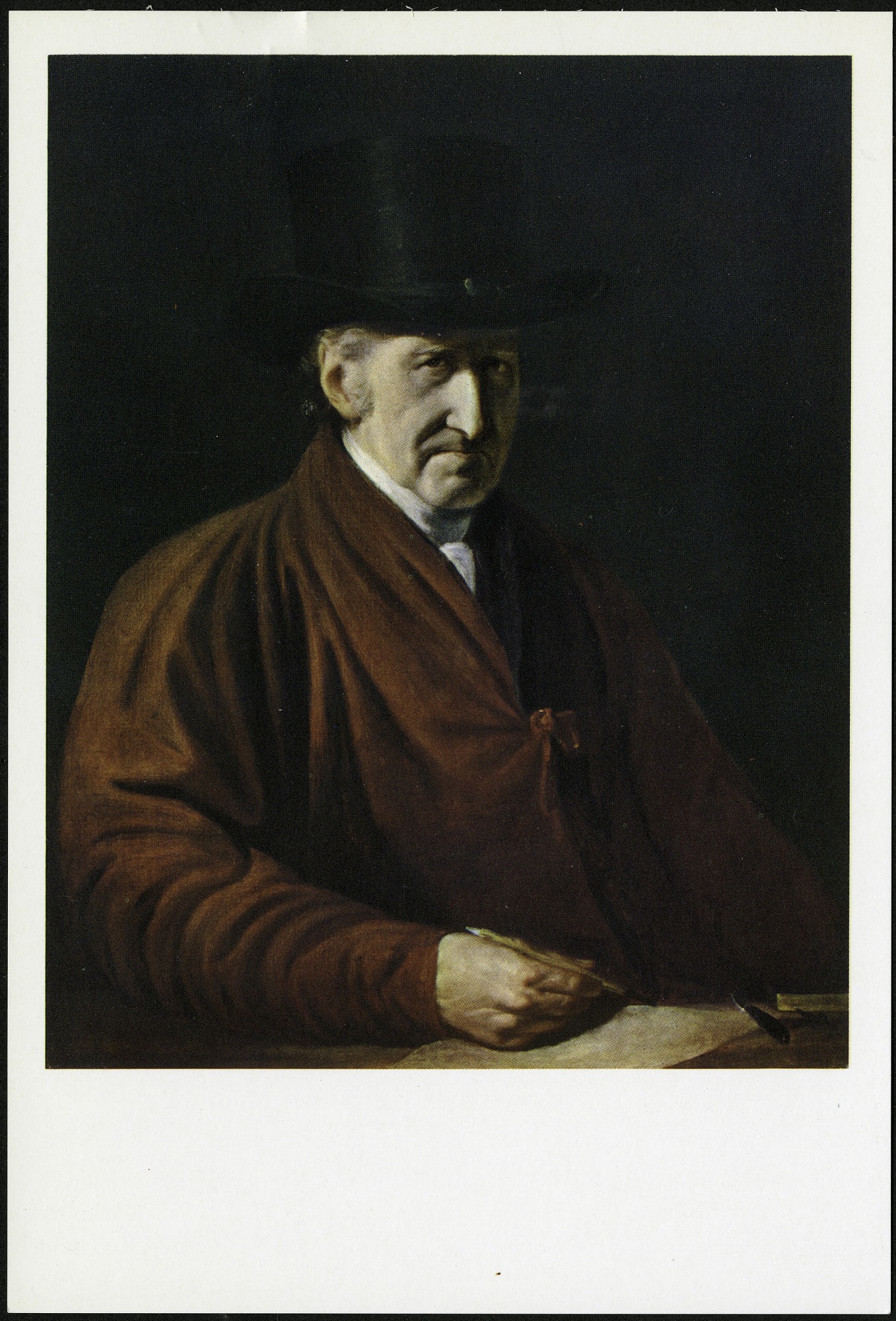 Color postcard of a self-portrait done by Benjamin West in 1819 from the National Collection of Fine Arts, now in the collections of the Smithsonian American Art Museum. The front of the postcard has a white border. The postcard is unused.
