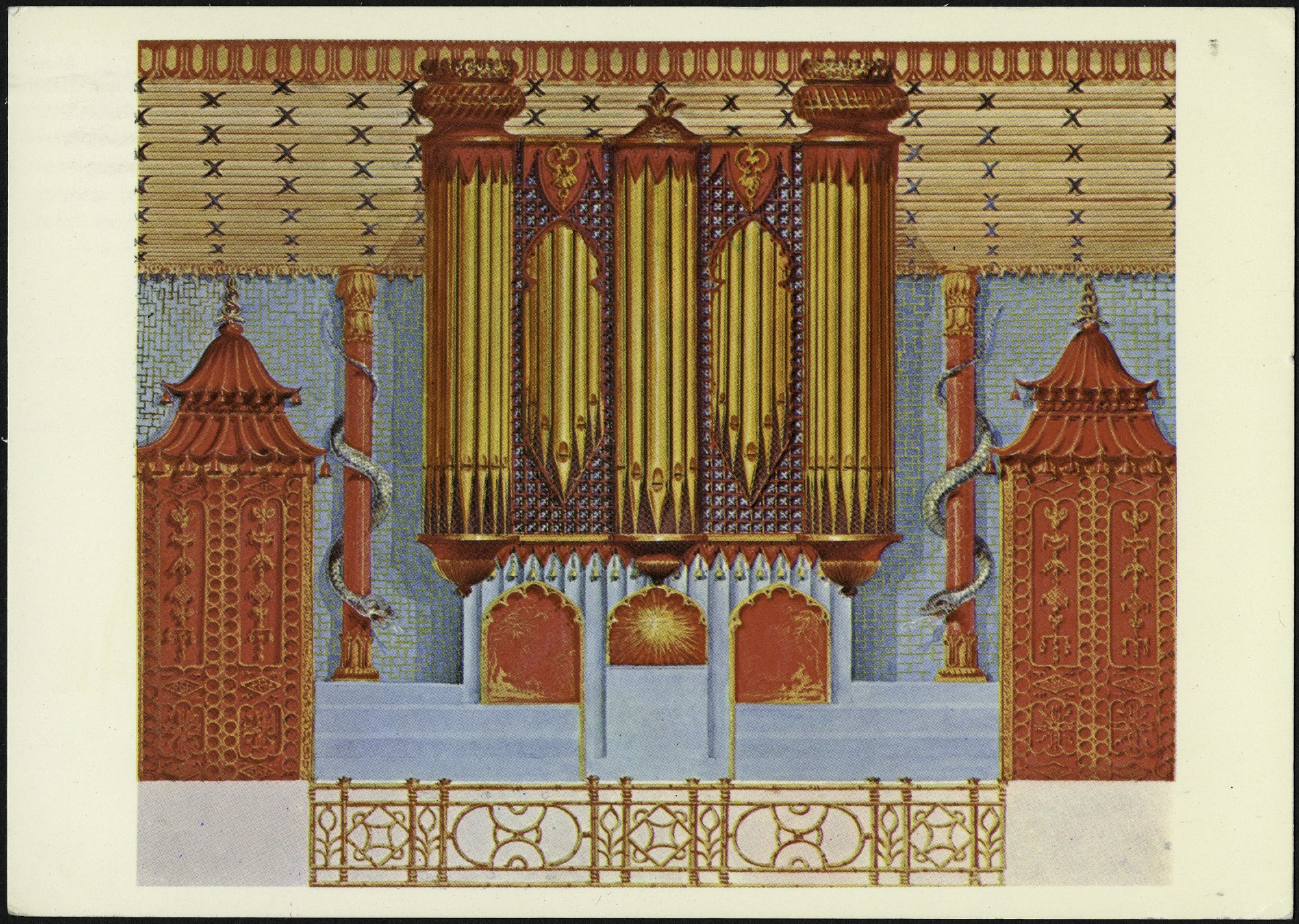 - Color postcard of a paintingof an organ by Frederick Crace, English, 179-1859, North Wall, Music Room, Brighton Pavilion, watercolor and gouache, at the Cooper-Hewitt National Design Museum. It has rich red and gold hues. The front of the postcard has a white border. The postcard is addressed to Cynthia A. Hoover, Curator of Musical Instruments at the National Museum of American History, with a message for her, as follows: