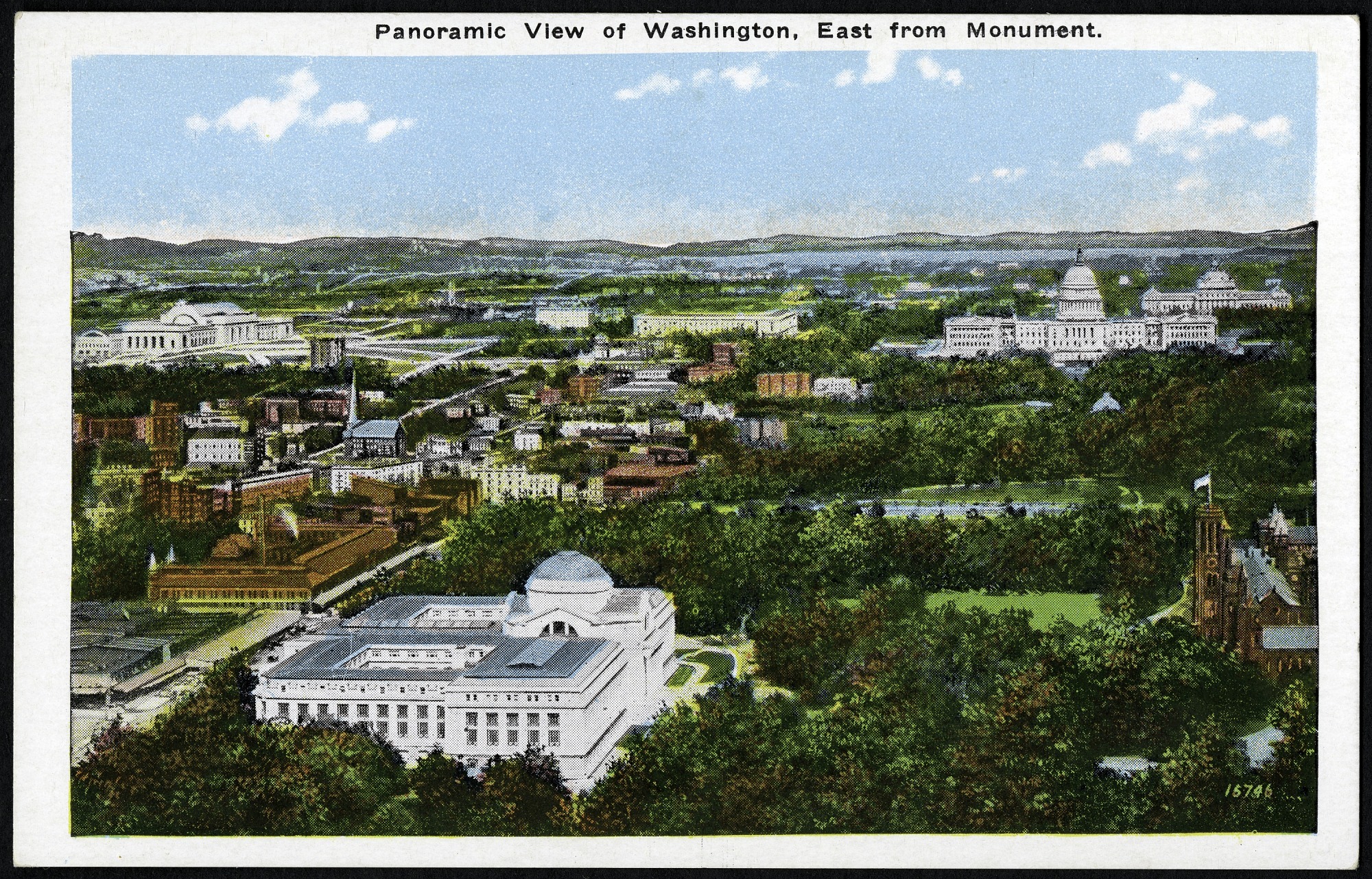 Color postcard with a panoramic view of Washington, D.C., looking east from the Washington Monument. The front of the postcard has a white border. The postcard is unused, but the message side has a printed note about the image: "In this view looking east from the Washington Monument may be seen the Smithsonian Institution, New National Museum [National Museum of Natural History Building], Union Station, Senate Office Building, U.S. Capitol, Library of Congress and House Office Building."