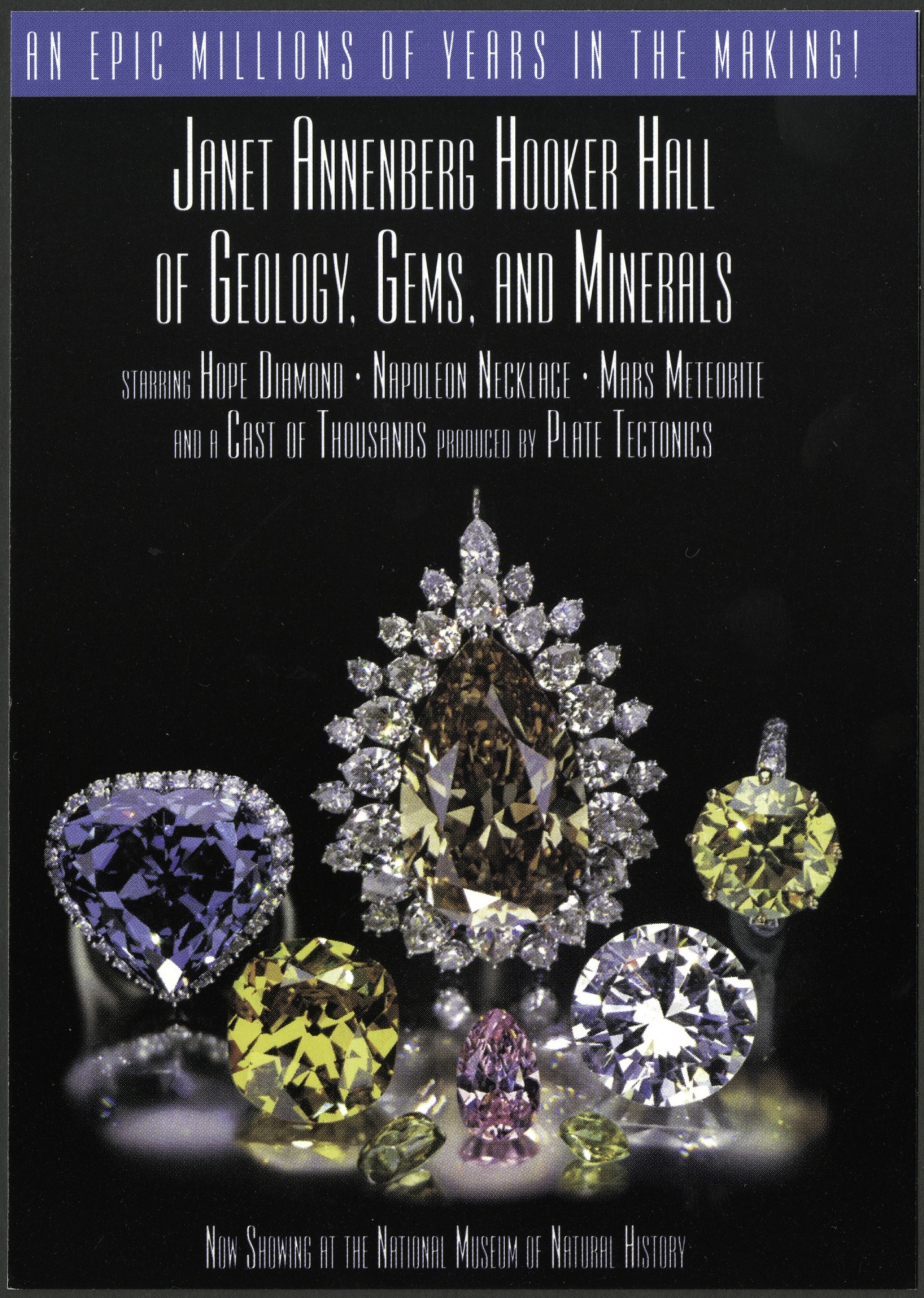 Color postcard advertising the opening of the Janet Annenberg Hooker Hall of Geology, Gems & Minerals at the National Museum of Natural History. Various gemstones are set against a black background on the front. The postcard is unused, but the message side has printed information about the new hall in the museum.
