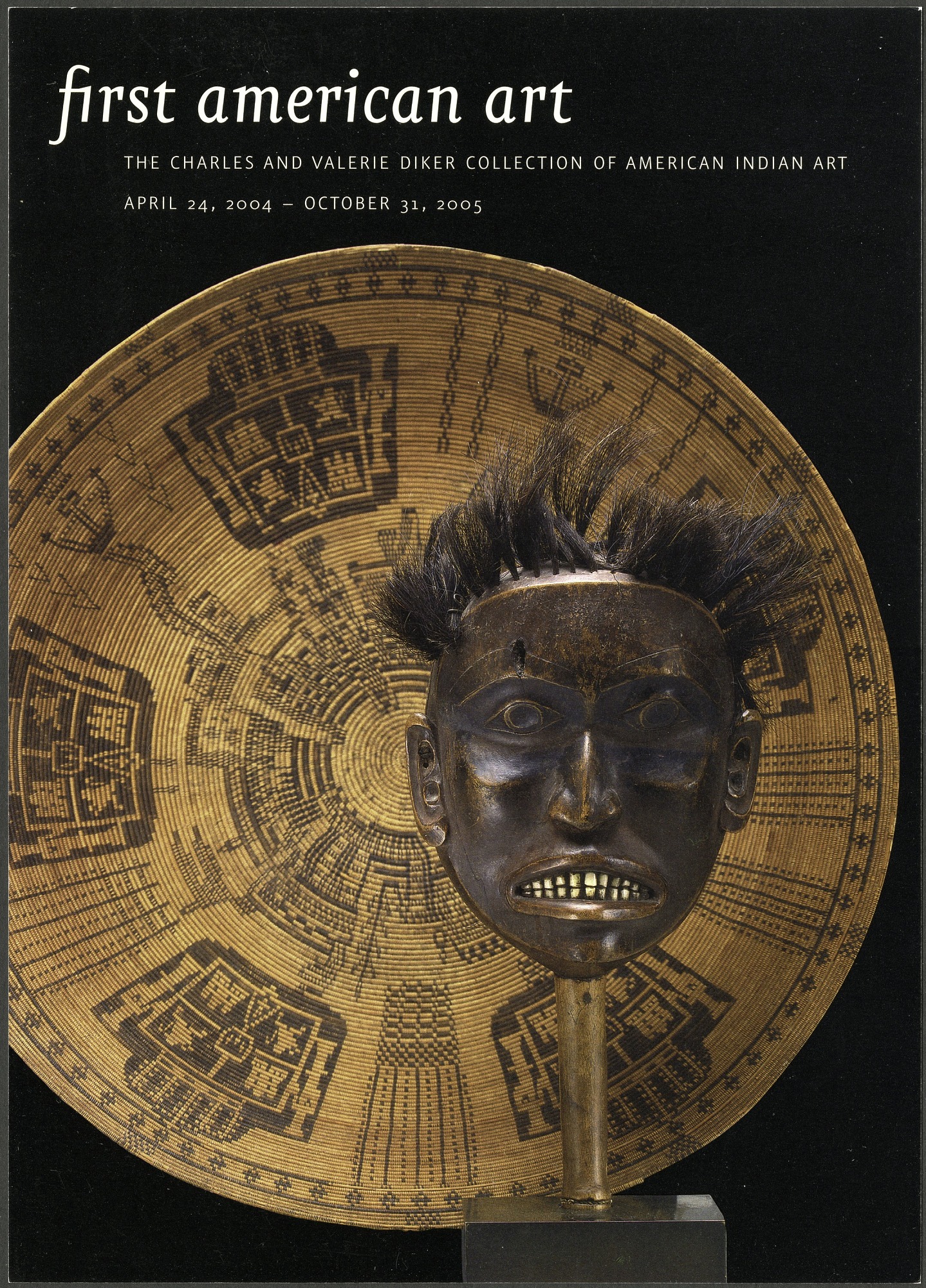 Color postcard advertising special activities for the "First American Art: The Charles and Valerie Diker Collection of American Indian Art" exhibit at the National Museum of the American Indian. The front of the postcard has an image of a coin bowl and a rattle that looks like a head, against a black background. The postcard is unused, but the message side is filled with information about special activities for the exhibit.