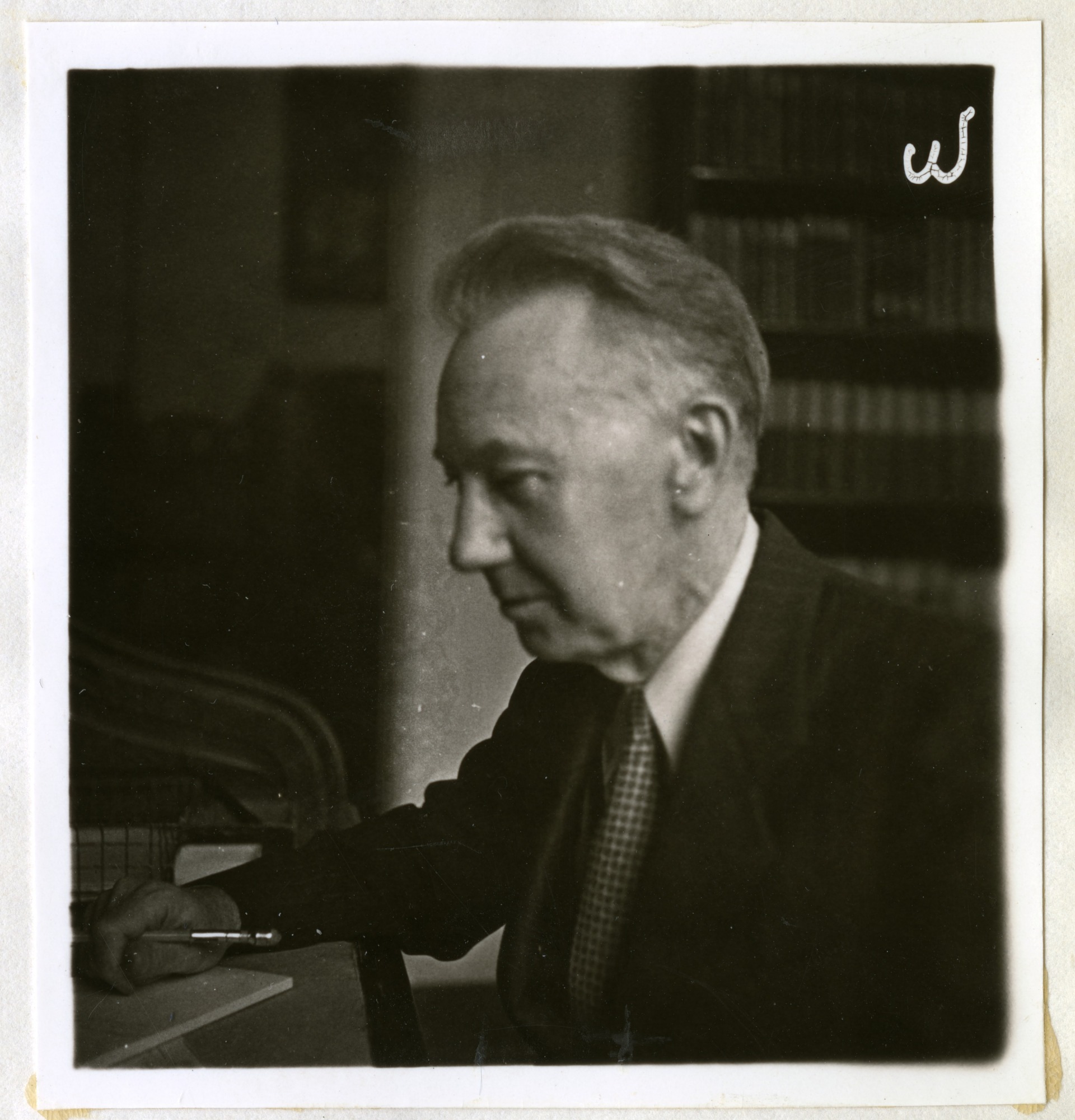 Theodore Thomas Belote, Curator of the Division of History at the United States National Museum, is seated at a desk and holds a pencil in his right hand.