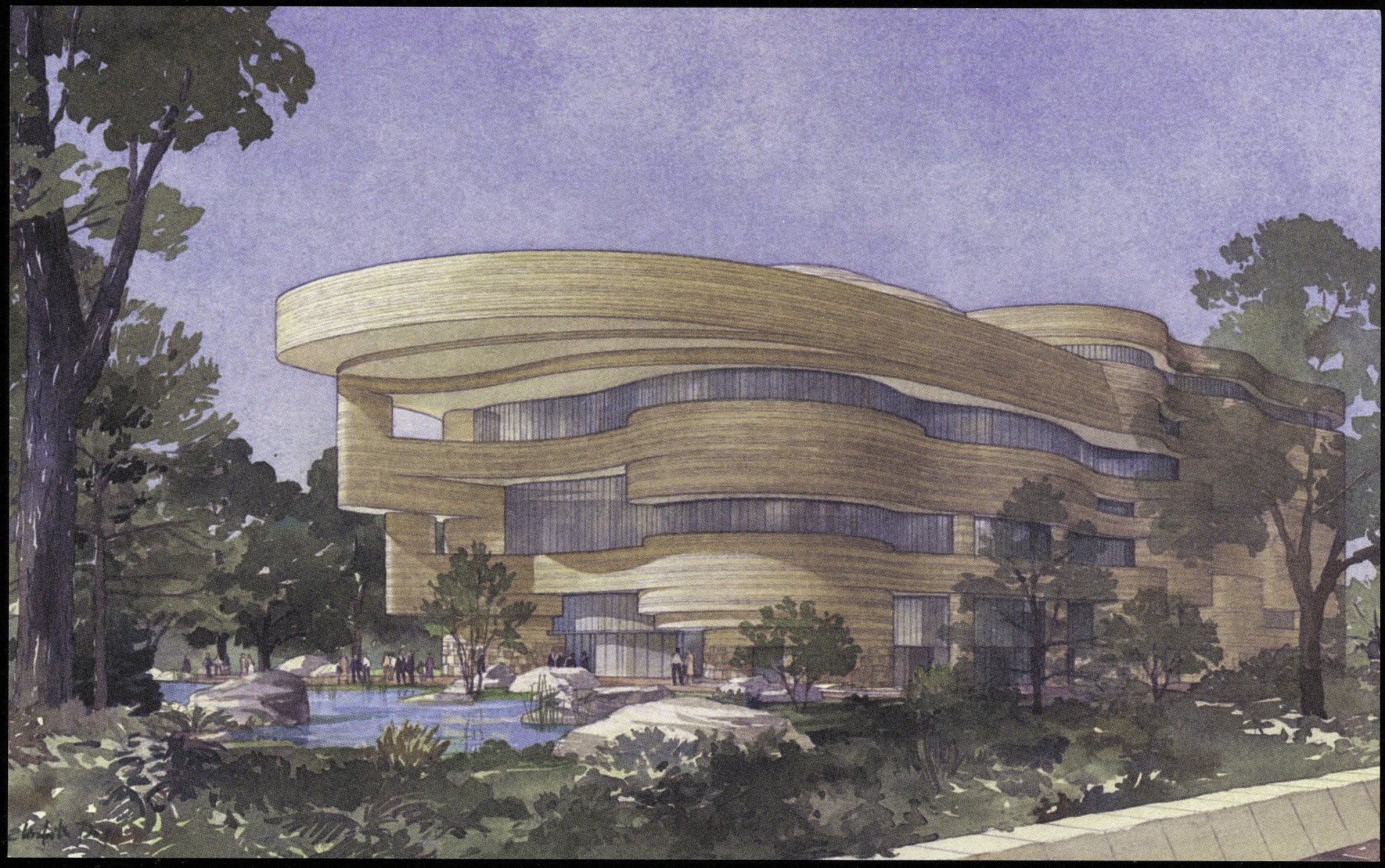 Color postcard advertising on Friday, July 21, 2000, in Denver Colorado, of a one-day exhibition from the National Museum of the American Indian called "Return to a Native Place: Creating the National Museum of the American Indian." The front of the postcard is a watercolor rendering of a model of the National Museum of the American Indian. The postcard is unused, but the message side has printed information about the exhibit.