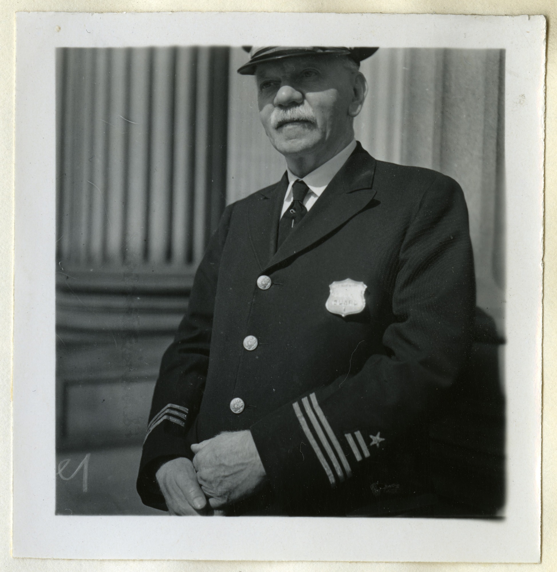 Captain George Johnson, a security guard at the United States National Museum's Natural History Building, stands beside a column of the building. Captain Johnson officially retired on July 20, 1938.