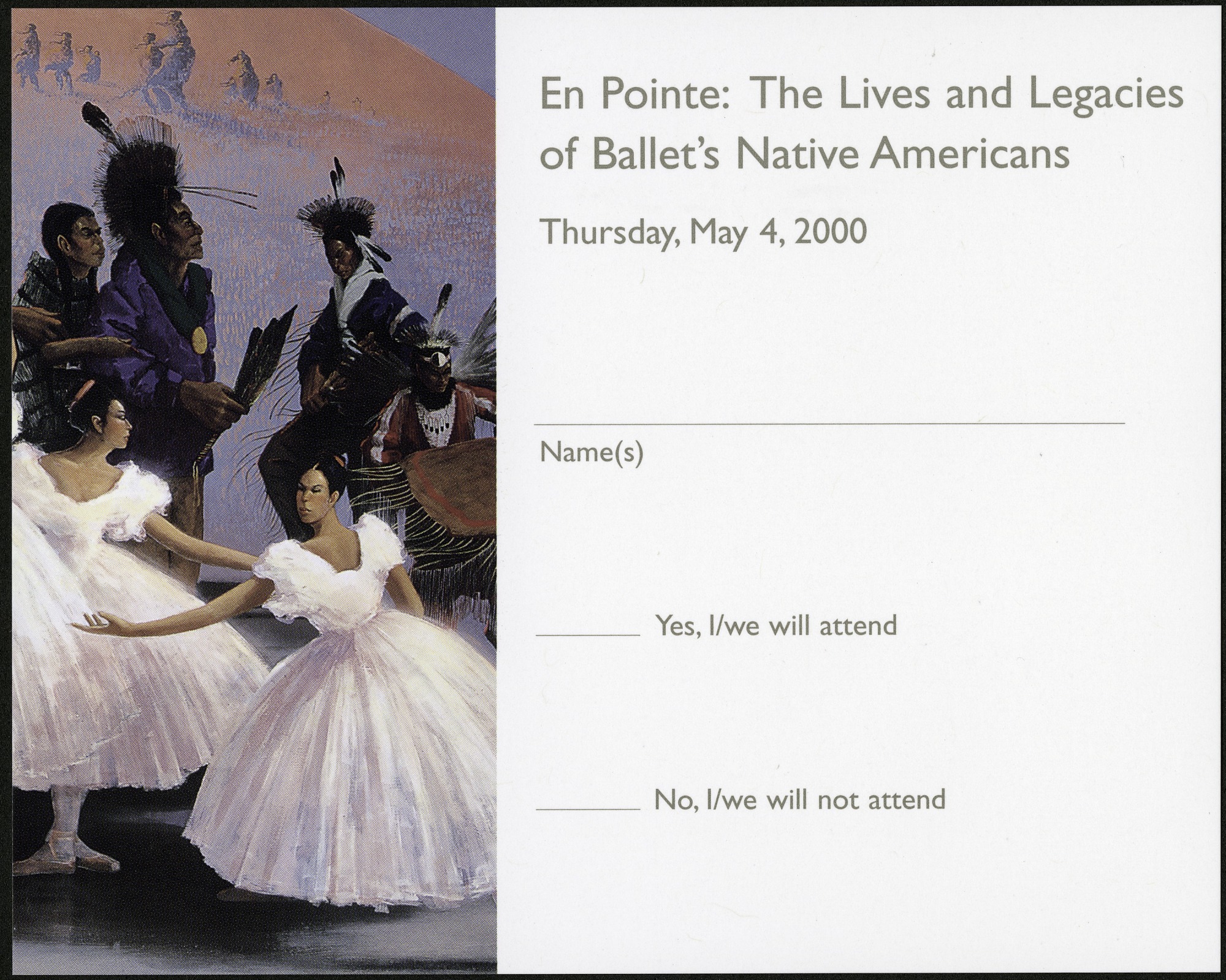 Color postcard to RSVP to a viewing on Thursday, May 4, 2000, to the "En Pointe: The Lives and Legacies of Ballet's Native Americans" exhibit premiere at the National Museum of the American Indian. The left side has a painting of Native Americans doing ballet, and the right side has RSVP options. The postcard is unused, and the address side was pre-addressed to NMAI.