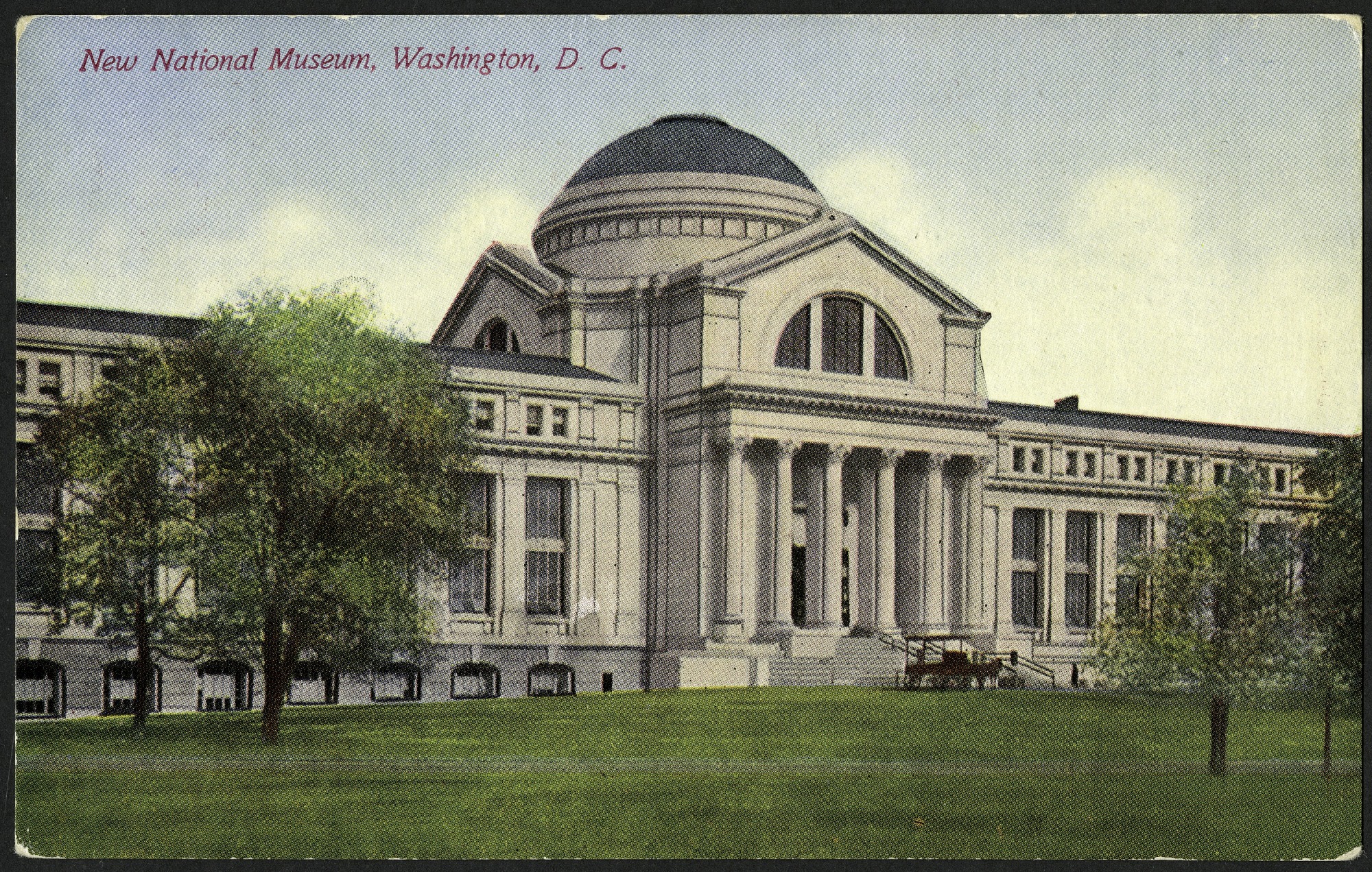Color postcard of the "new" National Museum, now the National Museum of Natural History. The building has a dark blue/gray roof, although in reality it is gold. The grounds are empty except for a horse-drawn carriage sitting in front of the museum. The postcard is unused, but the message side has a printed note about the museum: "The National Museum is located in the south part of the Smithsonian grounds. It is the recognized depository of all interesting objects of art and science. Open daily except Sunday, from 9:00 A. M. to 4:30 P. M."