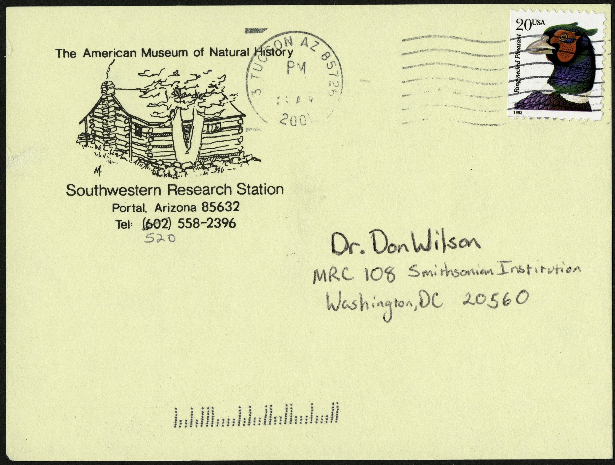 Color postcard to Dr. Don E. Wilson from the American Museum of Natural History's Southwestern Research Station in Arizona. The front has the address for Dr. Wilson and an image of a log cabin, drawn in black lines. The message side has a short message for him: "Dr. Wilson, In your room we found the following items: Straw Hat Pair of Socks If you want to pay postage we will send them to you. It was great meeting you and everyone else. Thanks, Chet Grisham"