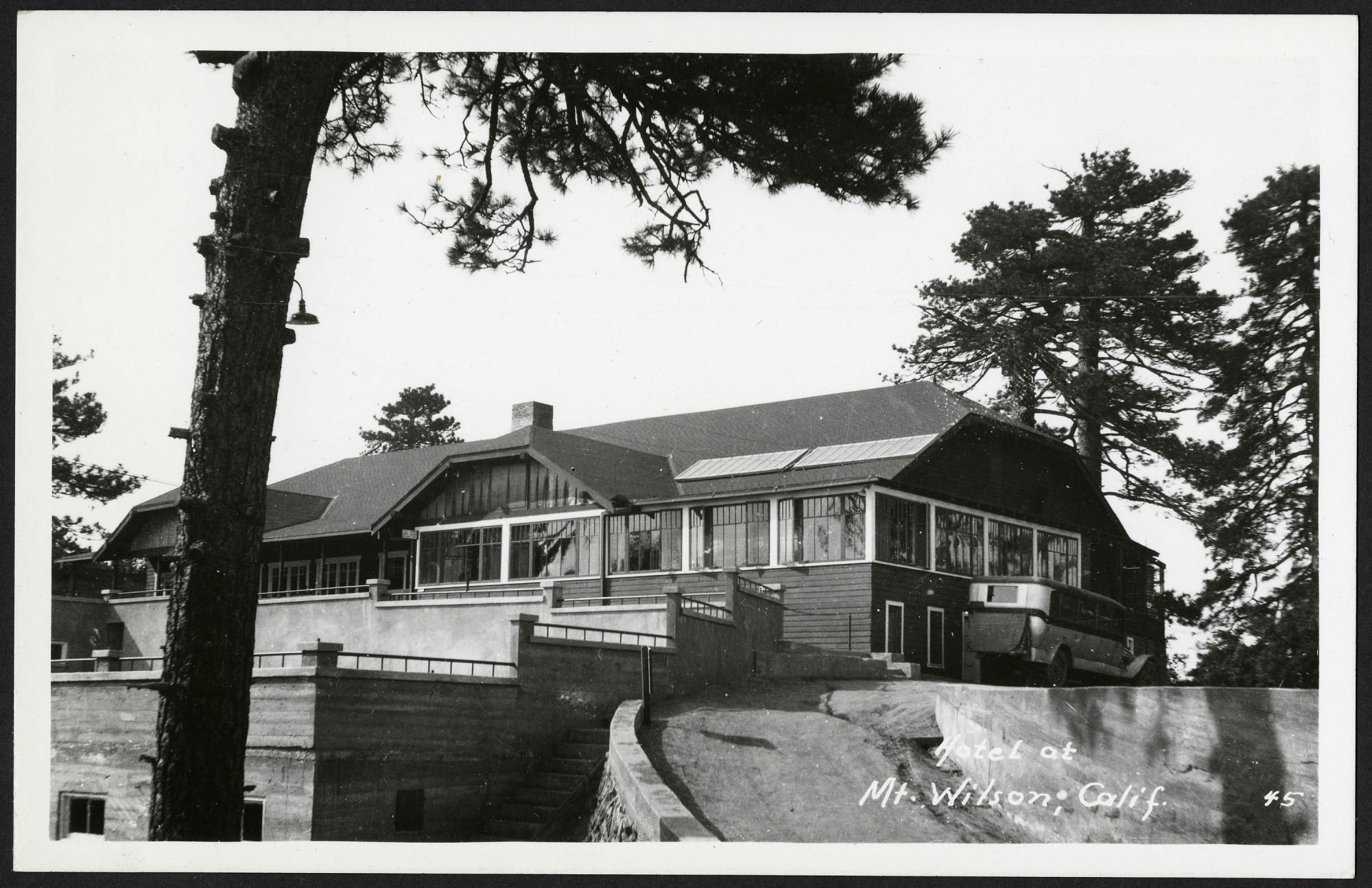 Grayscale, real photo postcard of a hotel at Mt. Wilson, California. A car is parked on the side of the hotel. The tree in front of the hotel on the left side of the postcard has had its lower branches cut off. The front of the postcard has a white border. The postcard is unused.