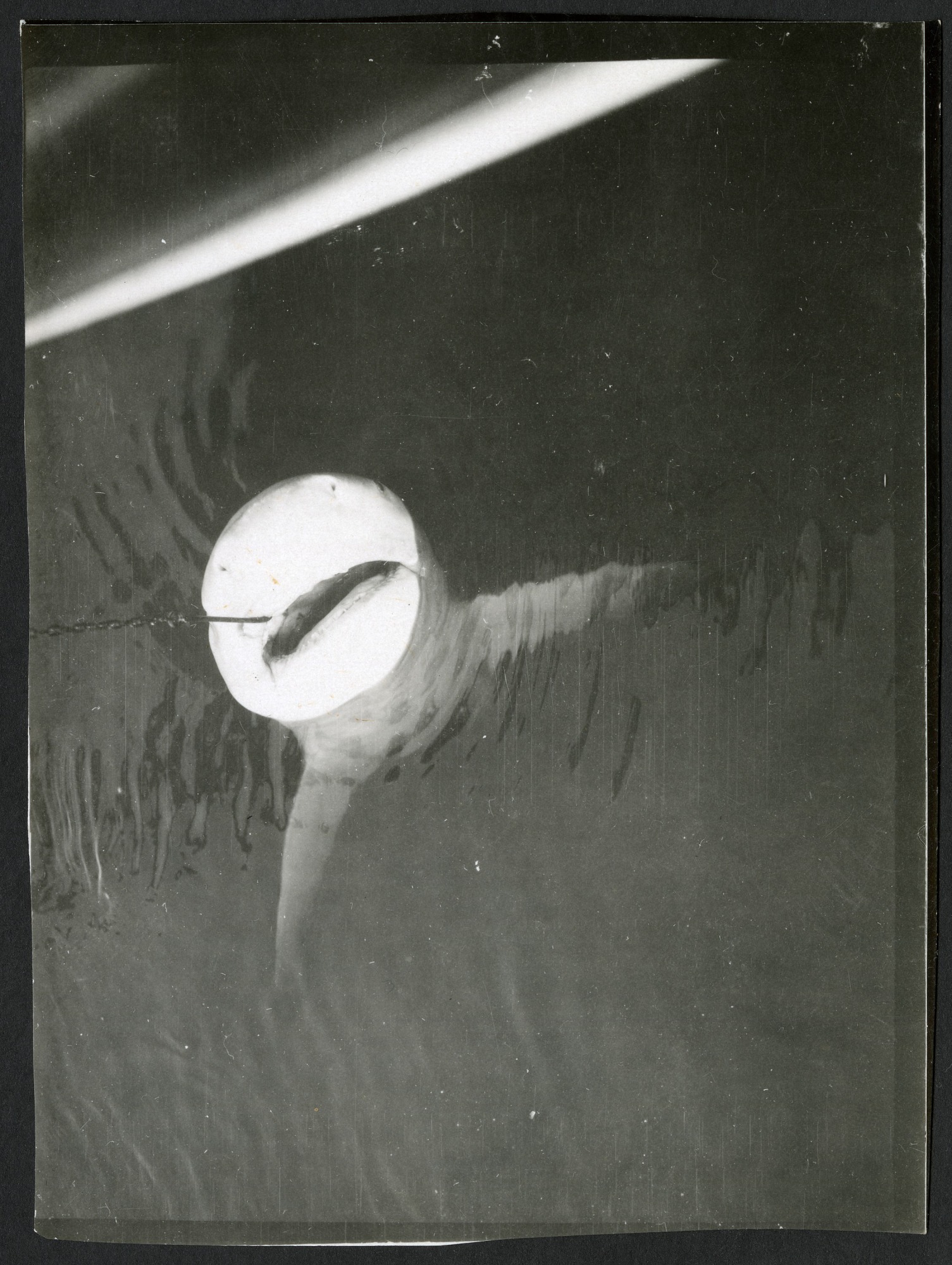 Image of the head and mouth of a shark caught on a line as it is pulled out of the water. The shark's two pectoral fins can be seen underneath the water. The shark was caught by members Parish-Smithsonian Expedition, in 1930. The caption on the back of the image reads: Shark being brought to the surface, Port Tanamo, Cuba.