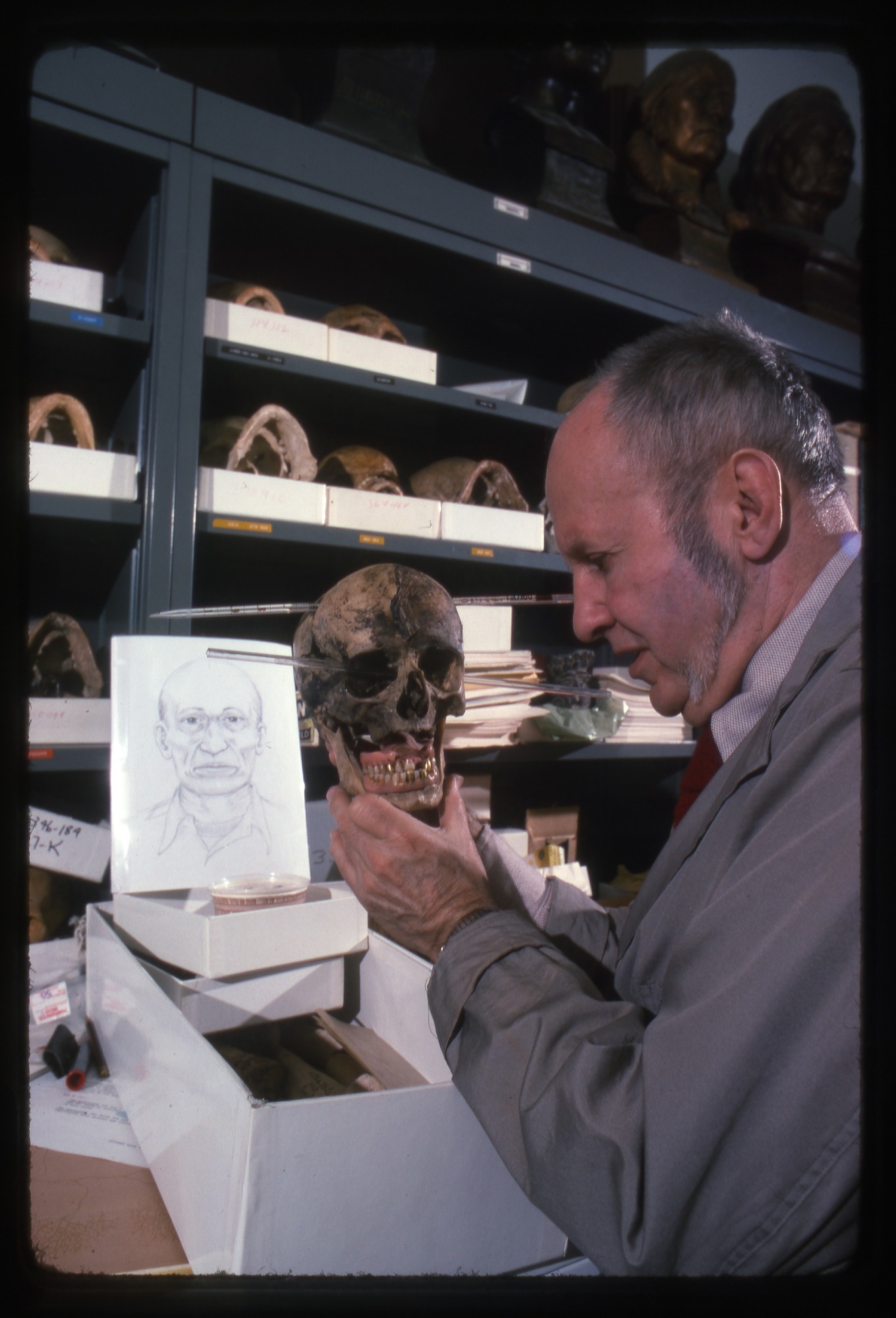 Dr. J. Lawrence Angel (1915-1986), physical anthropologist, holding a human skull in his hands. He was one of the nation's leading forensic authorities and an expert on human bones. Additional skulls are resting on shelving. A sketch of a man is displayed. In 1962 Dr. Angel joined the National Museum of Natural History, Smithsonian Institution as Curator of Physical (Biological) Anthropology. During his career at the Smithsonian he broadened his research emphasis to include forensic anthropology.