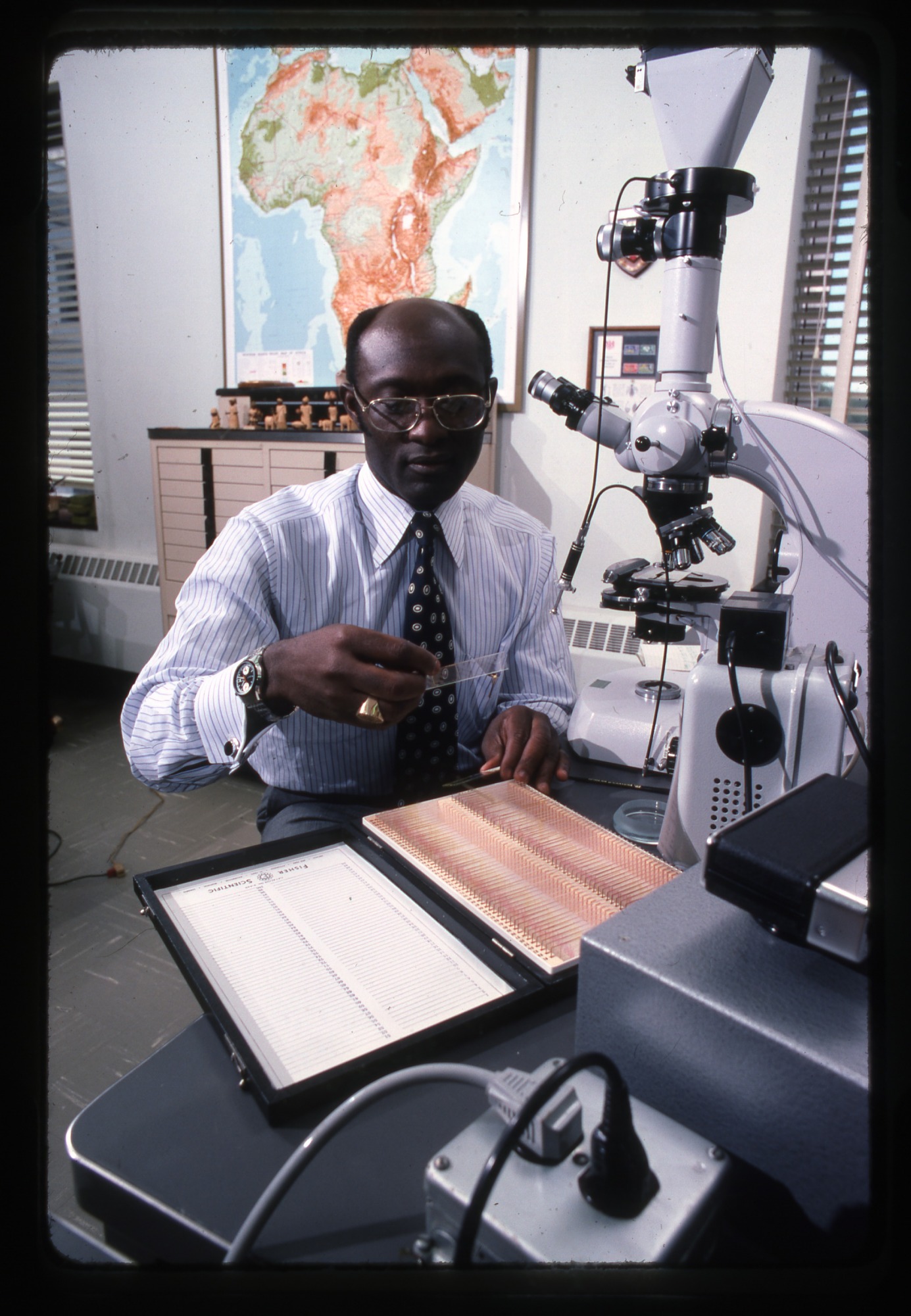 Dr. Edward Ayensu, Ghanaian economist, scientist, and Chairman, Department of Botany (from 1976 Smithsonian Institution Phone Directory), National Museum of Natural History (NMNH) at the Smithsonian Institution, Washington, D.C., is seated in front of a microscope and holds a slide in his hand. A box holding additional slides is on the table. A map of Africa is on the wall behind him.