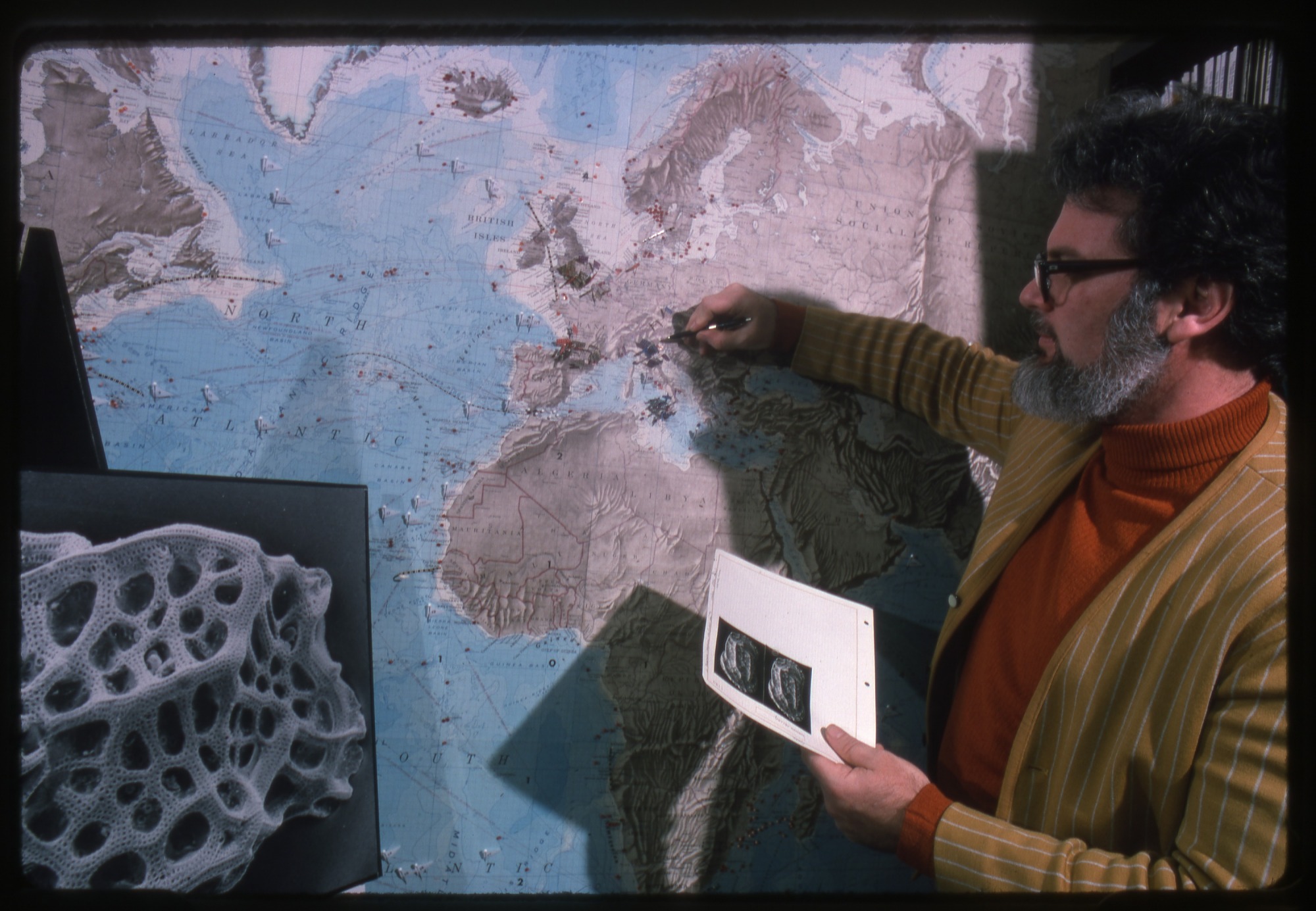 Richard H. Benson (1929-2003), 1964-1978, curator at the National Museum of Natural History, Department of Paleobiology, with a geographical map of the world behind him, points to a place in Europe with his right hand. Benson holds papers in his left hand. An image of an invertebrate fossil specimen is displayed on an easel to his left.